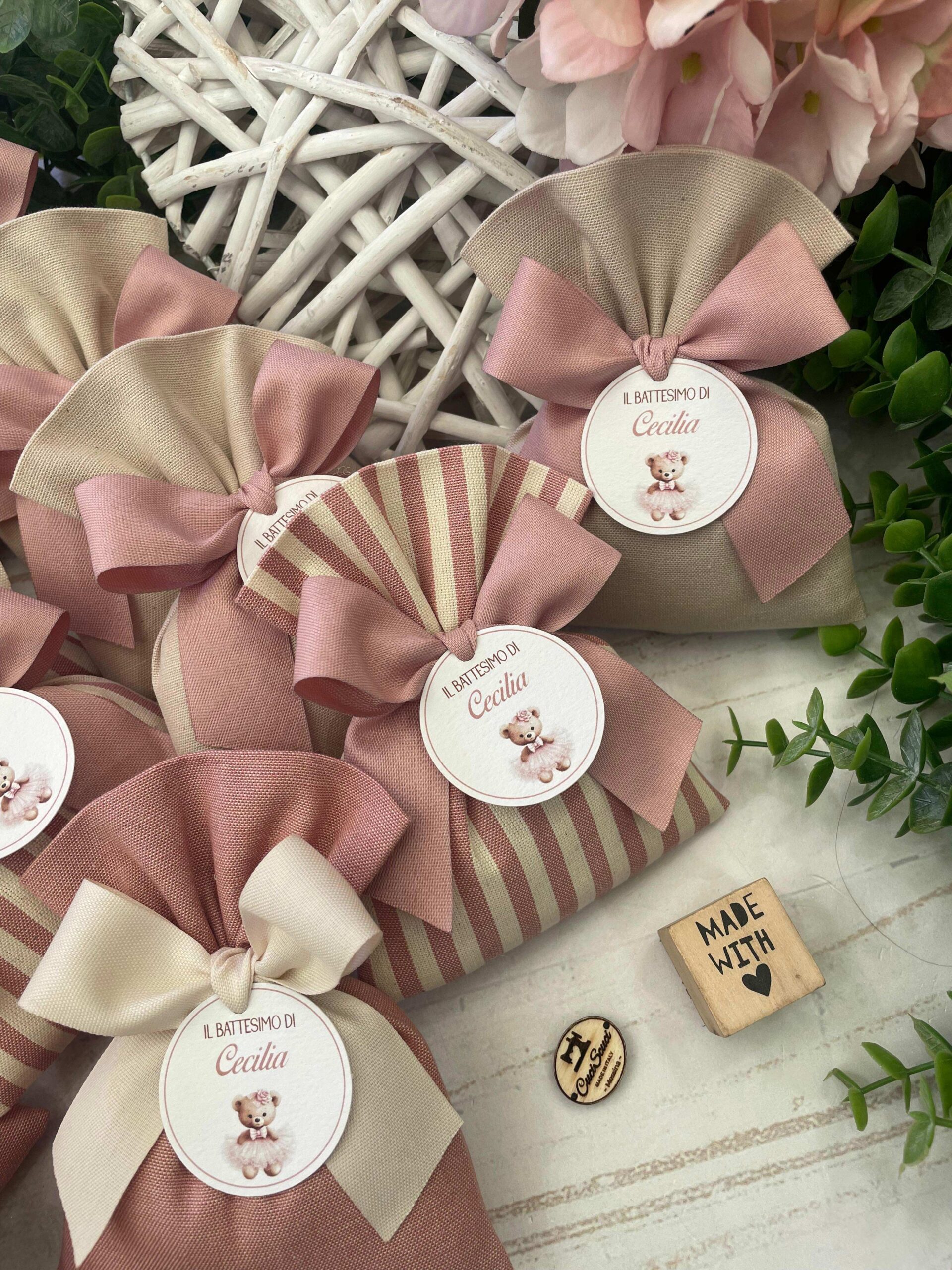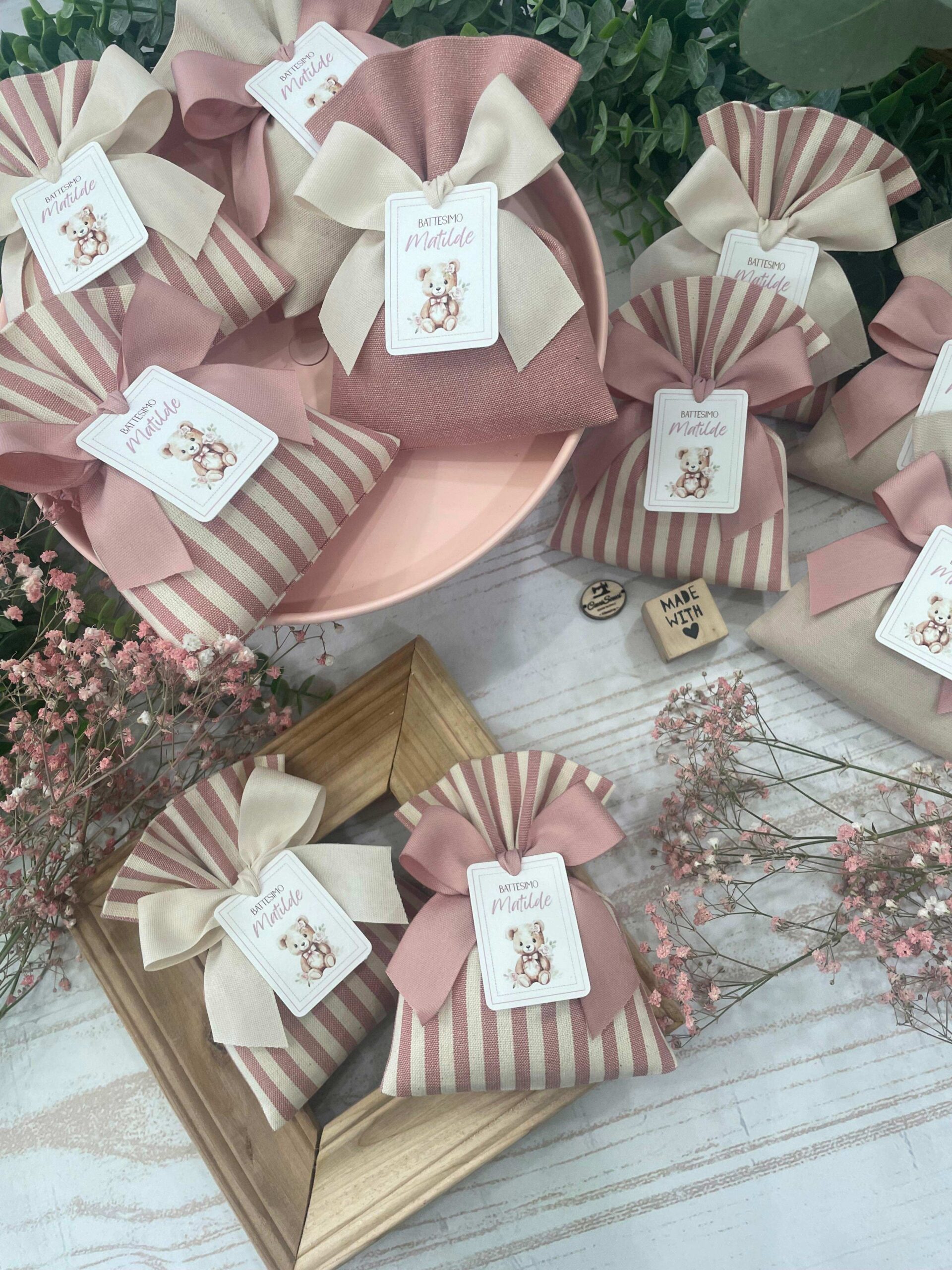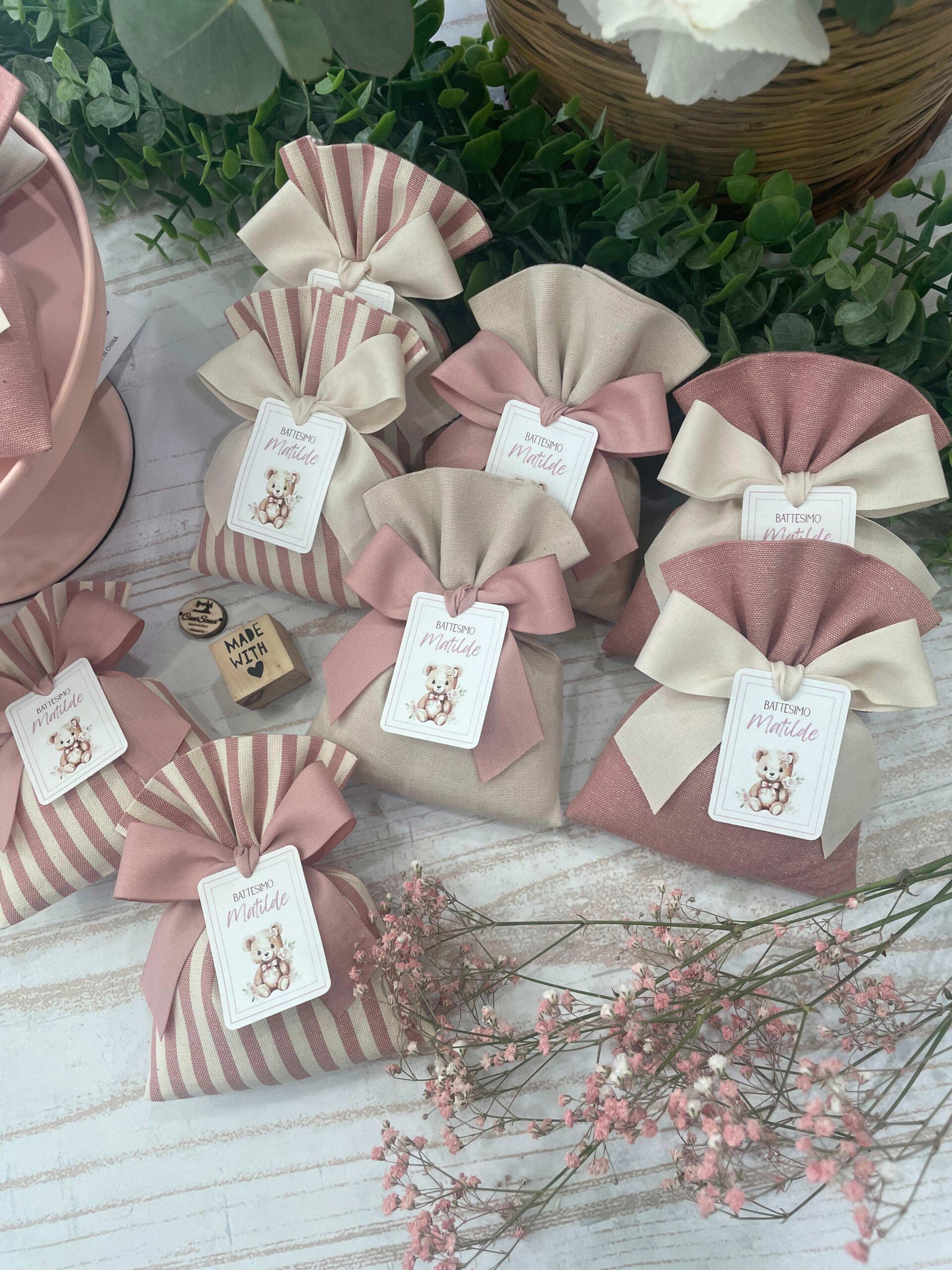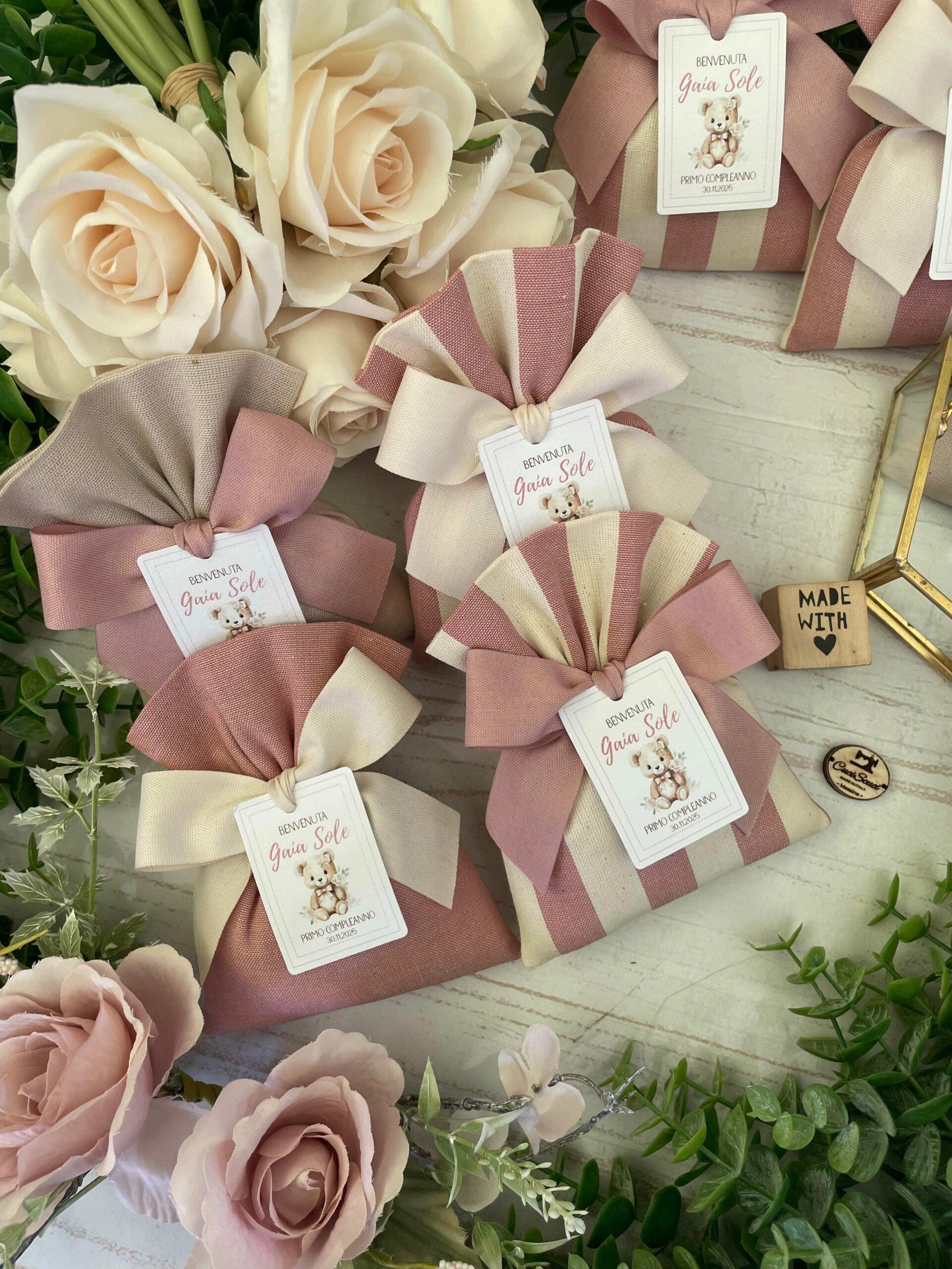 La bomboniera, pronta da donare ai tuoi ospiti, comprende il sacchetto, confezionato con imbottitura in ovatta, fiocco abbinato e 5 confetti in busta sigillata, con o senza tag.