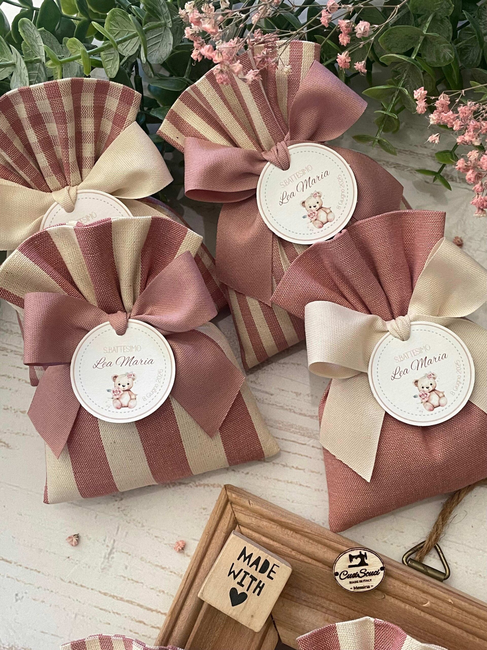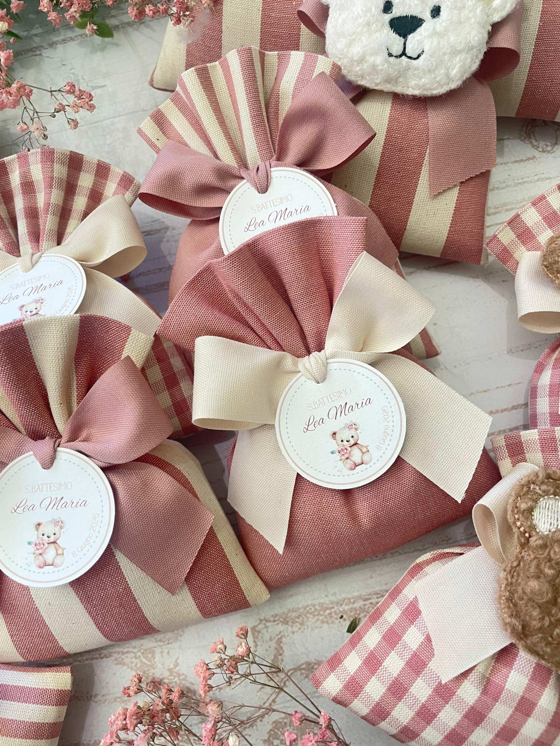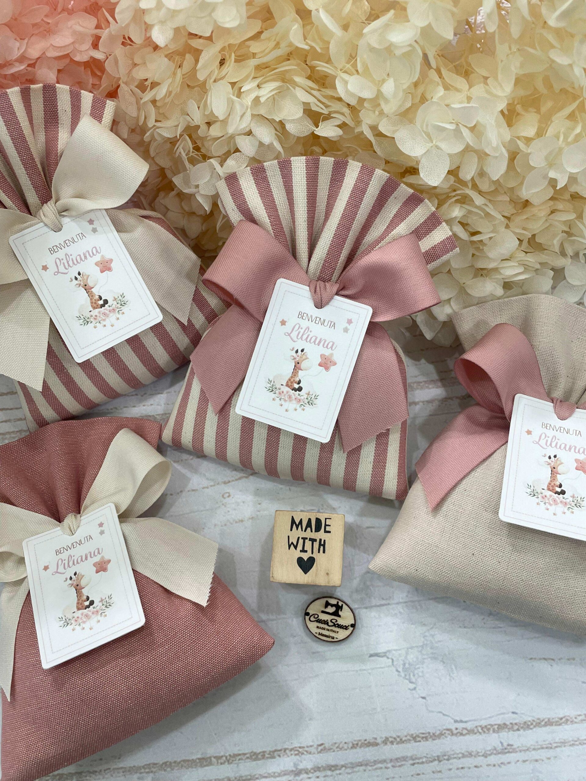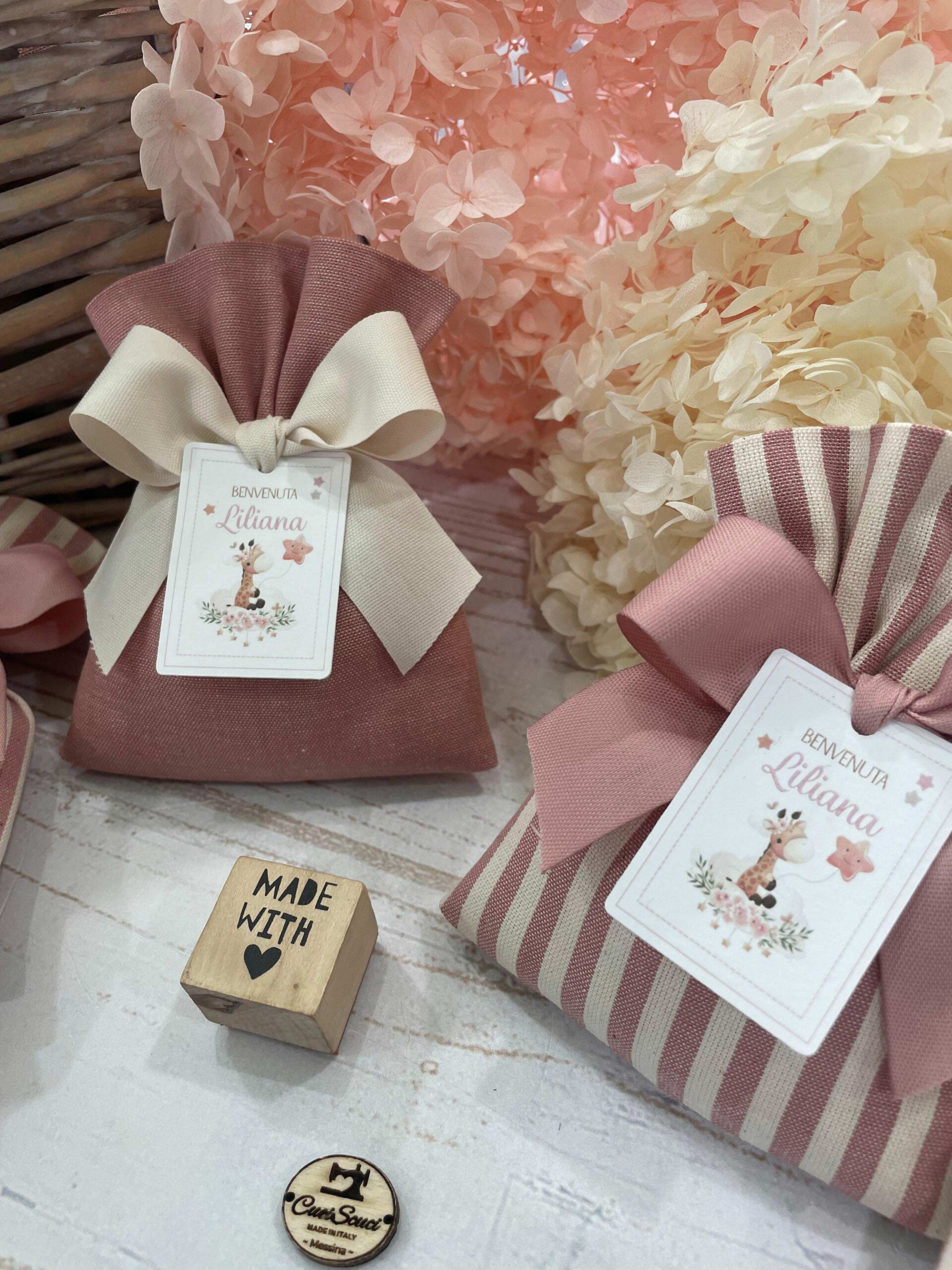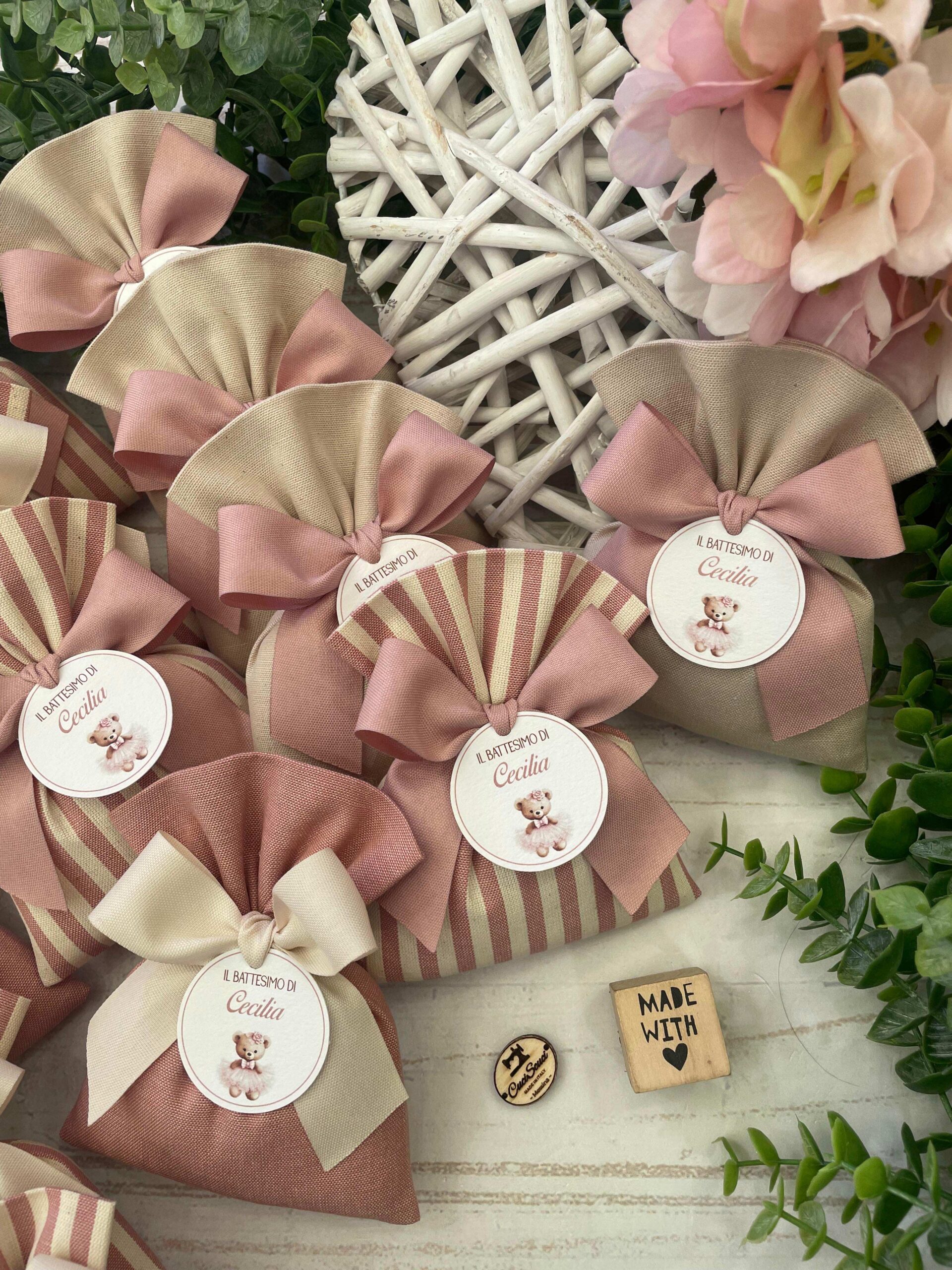 La bomboniera, pronta da donare ai tuoi ospiti, comprende il sacchetto, confezionato con imbottitura in ovatta, fiocco abbinato e 5 confetti in busta sigillata, con o senza tag.