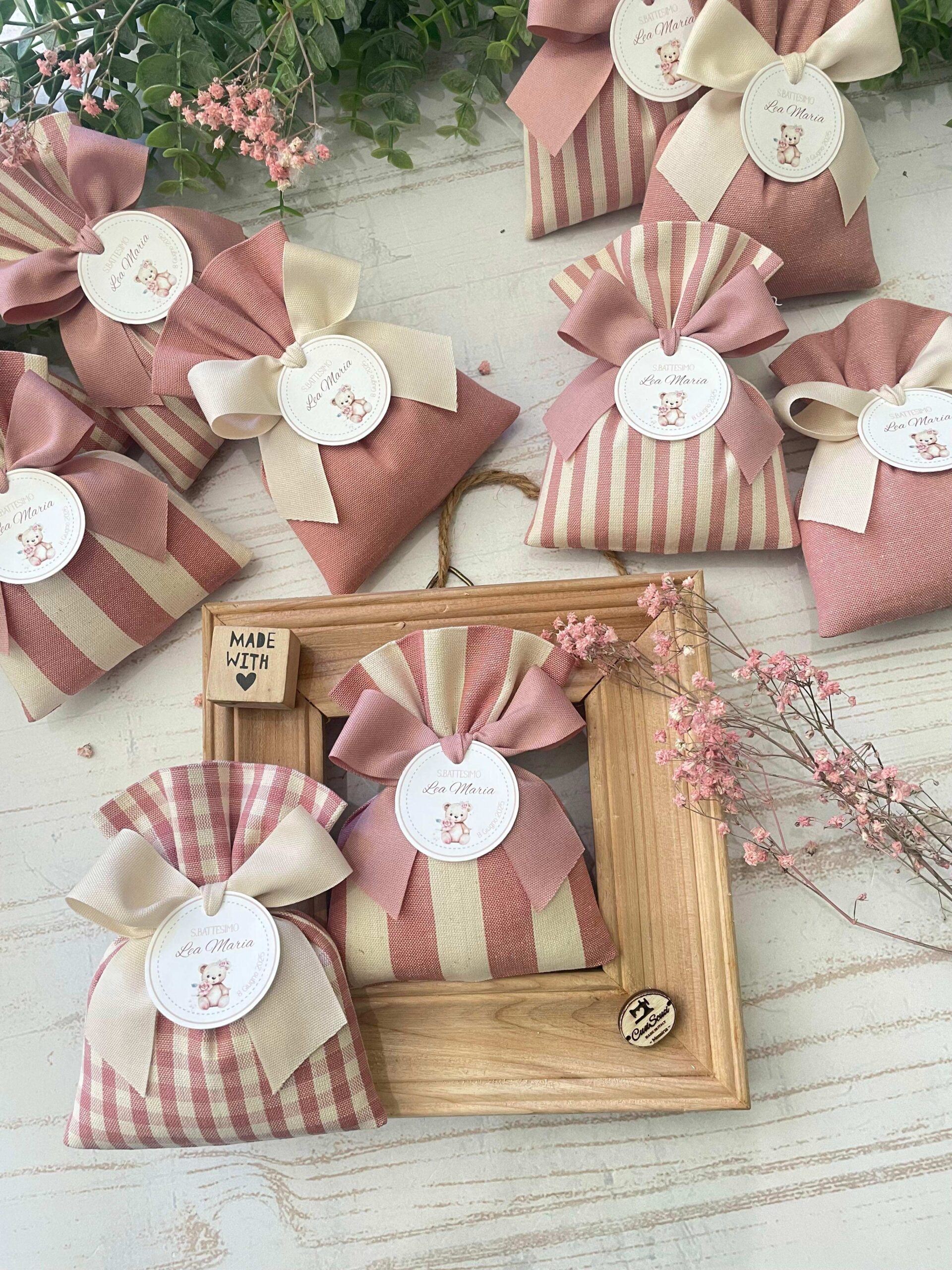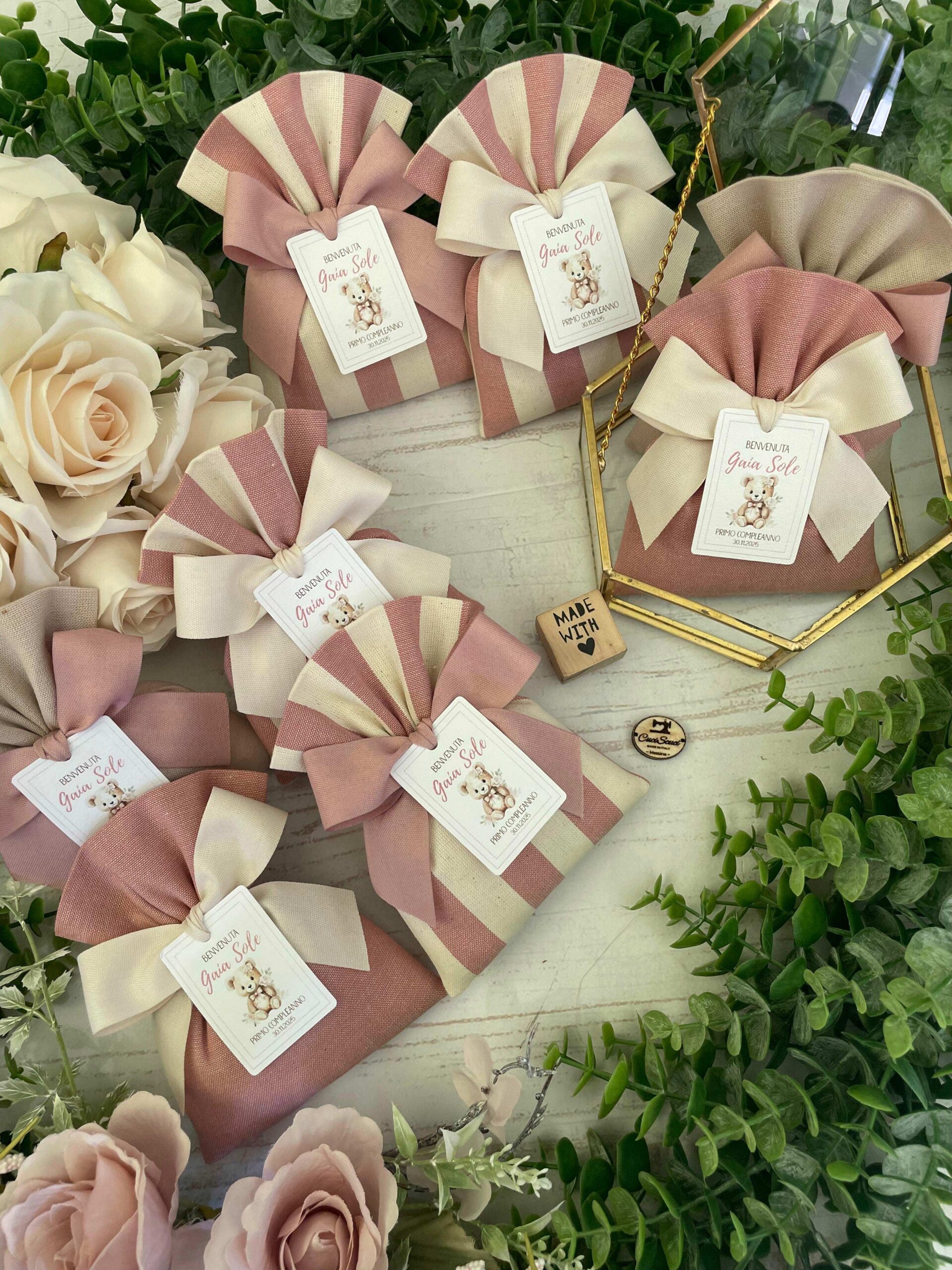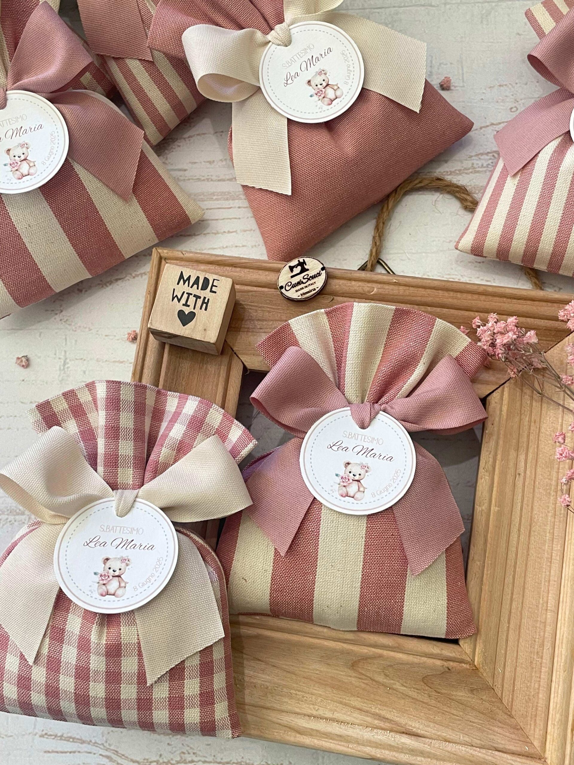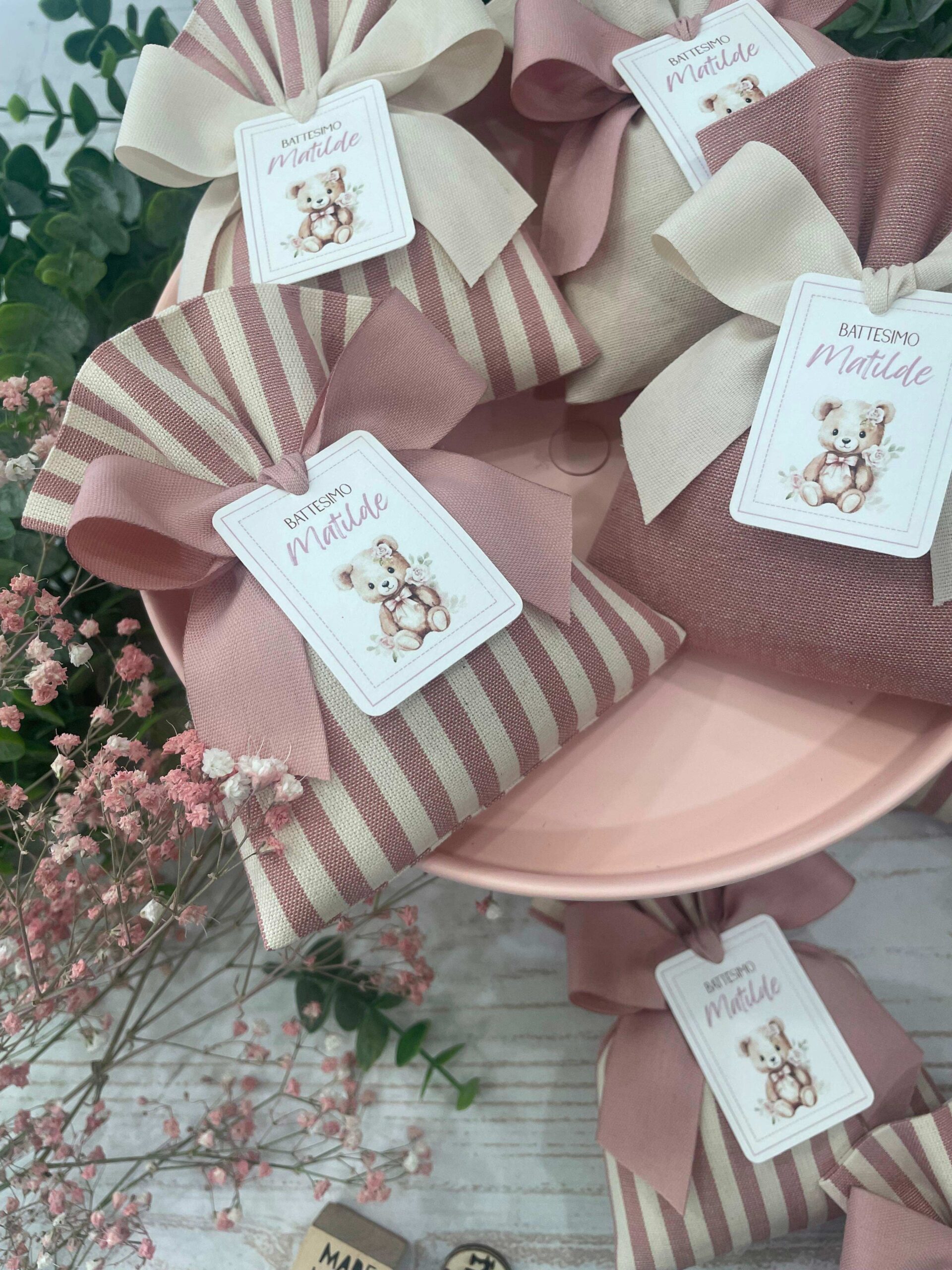 La bomboniera, pronta da donare ai tuoi ospiti, comprende il sacchetto, confezionato con imbottitura in ovatta, fiocco abbinato e 5 confetti in busta sigillata, con o senza tag.