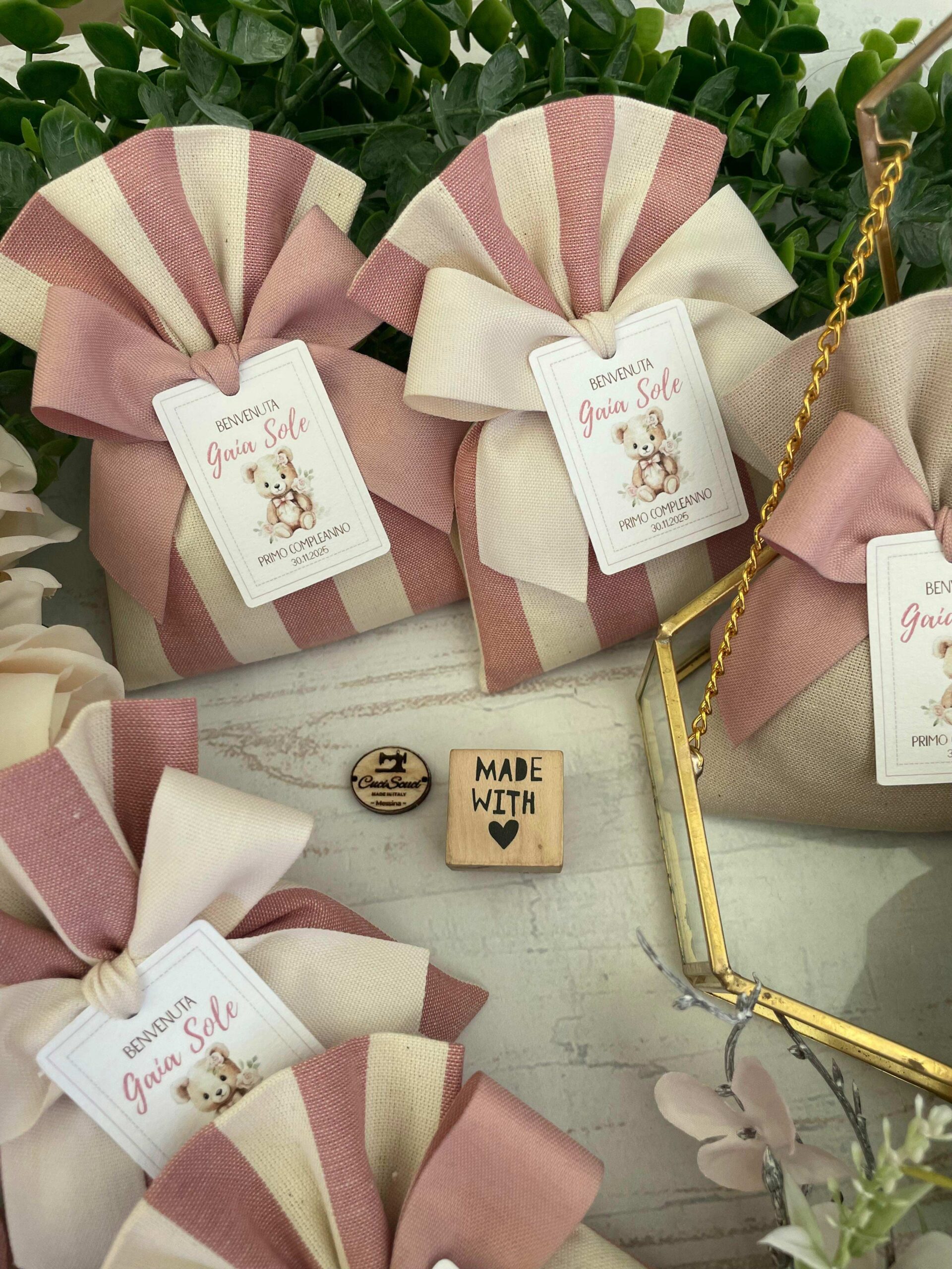 Realizzato con cotone tinto filo in fantasie assortite (o a scelta) nei toni del rosa antico e del mandorla con l’applicazione di un tag personalizzato.