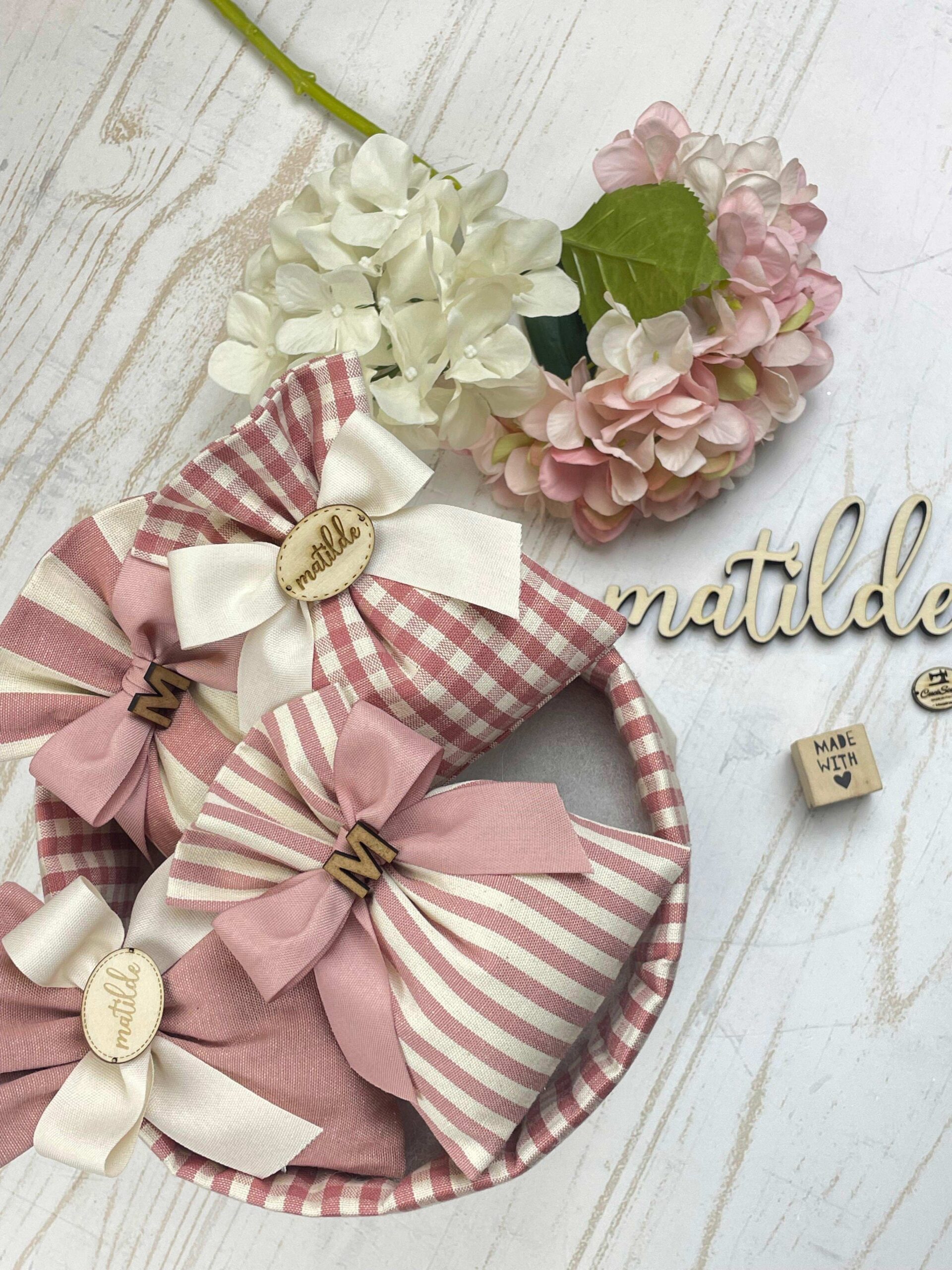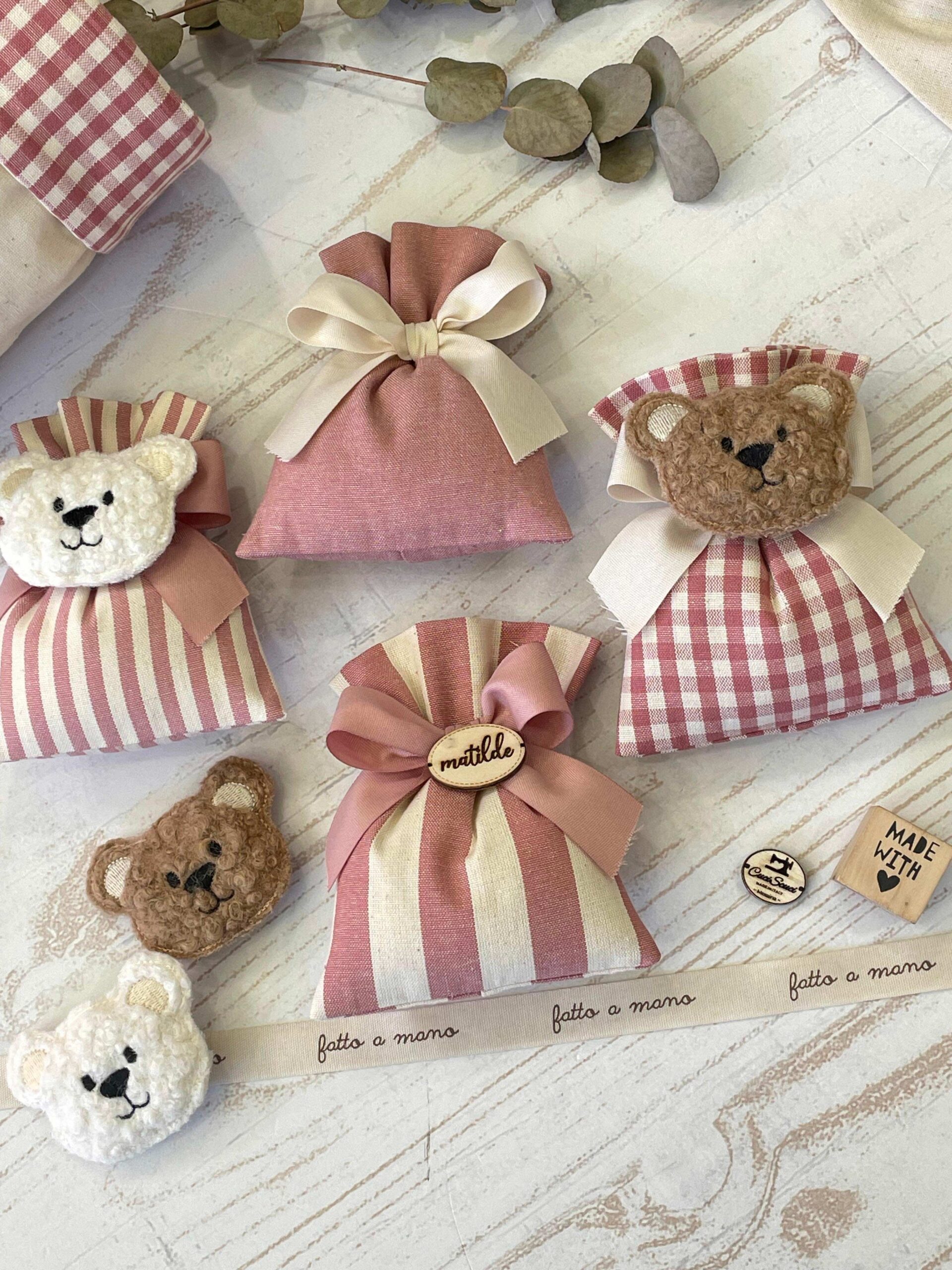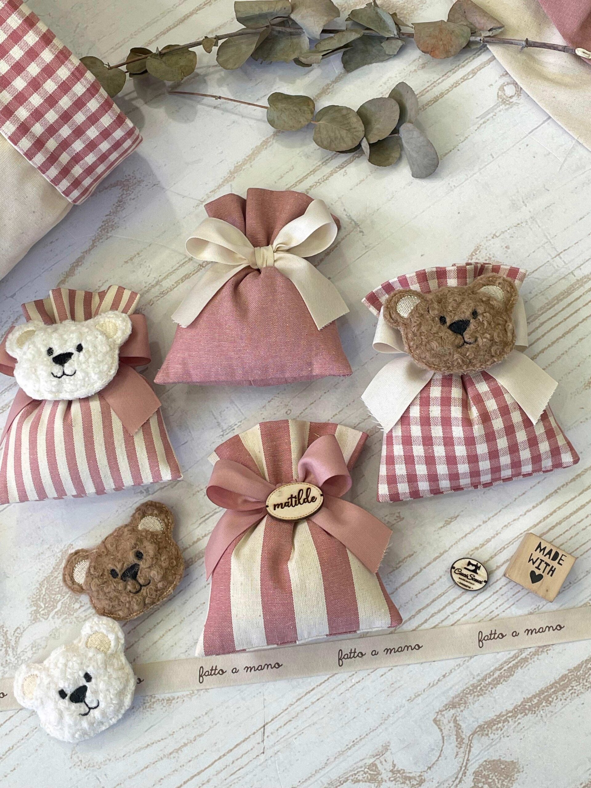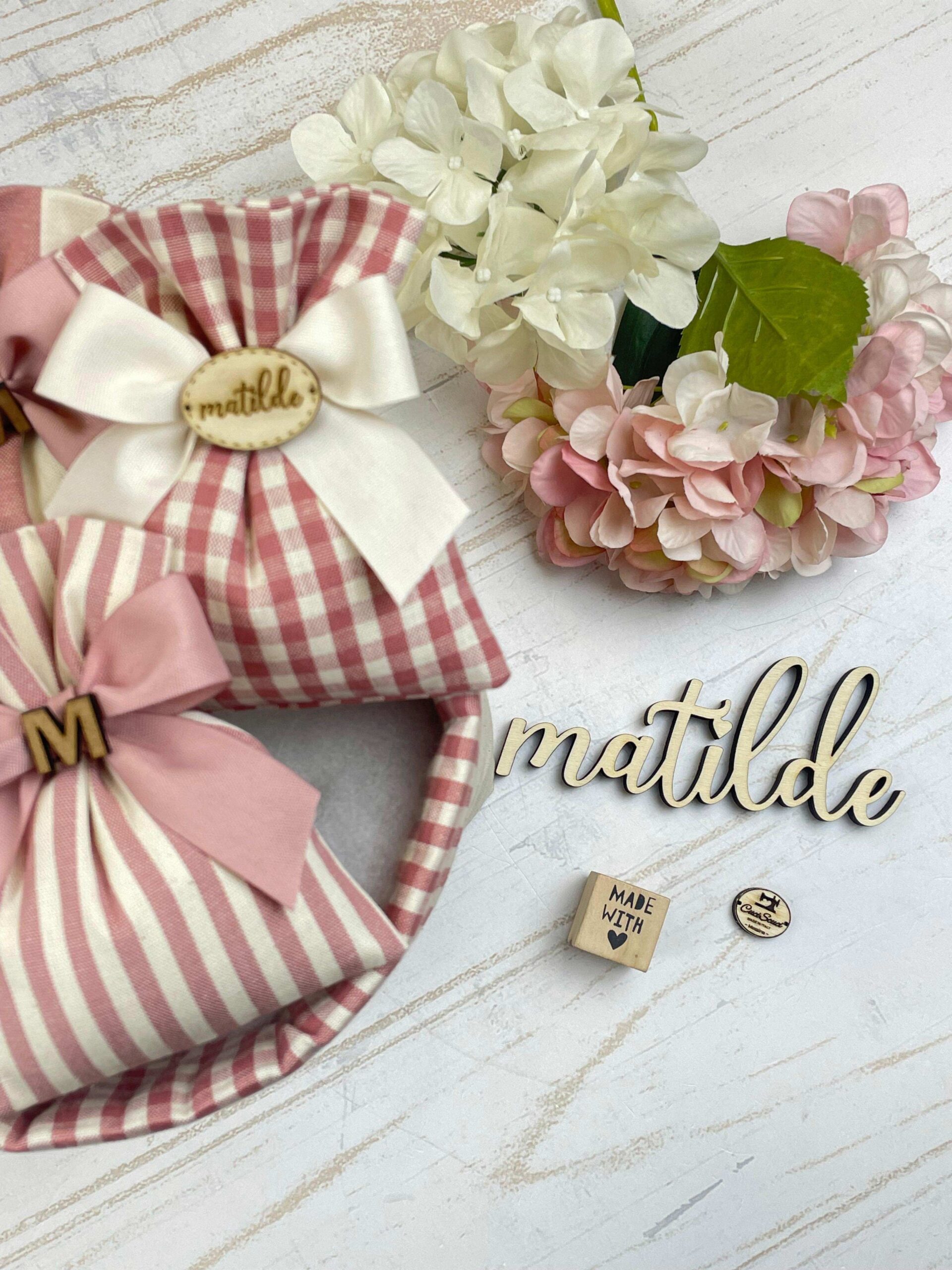 Realizzato con cotone tinto filo in fantasie assortite, o a scelta, nei toni rosa antico e del panna, con l’applicazione di una targhetta in legno personalizzata o di un orsetto in tessuto bouclè.