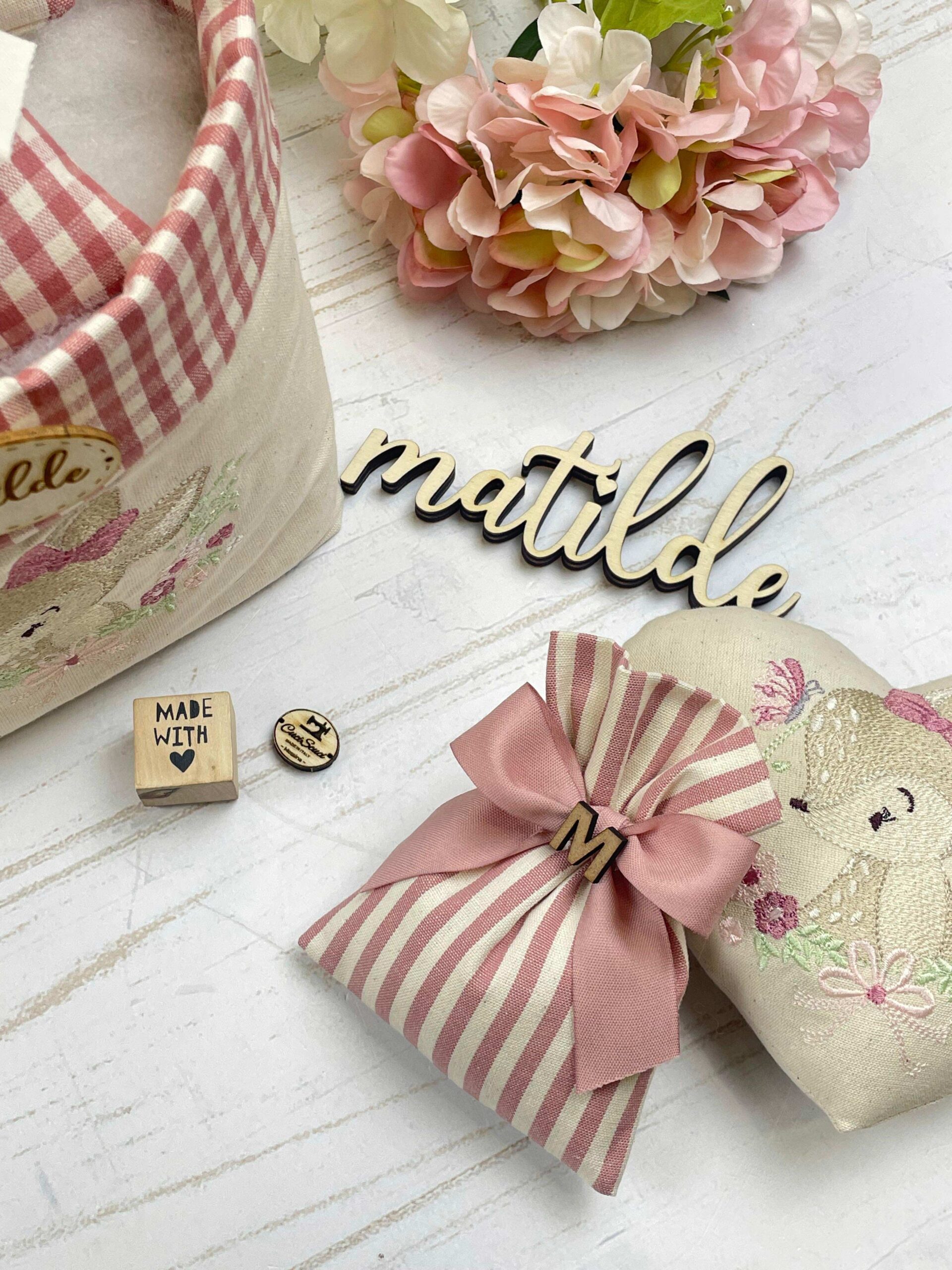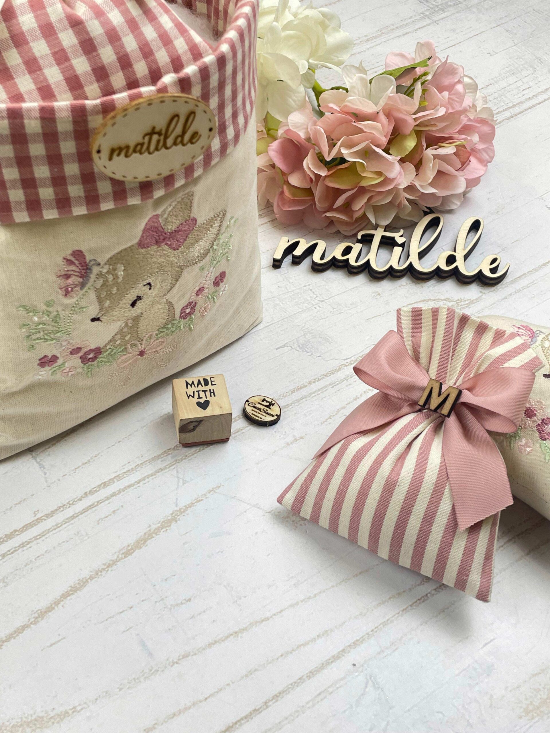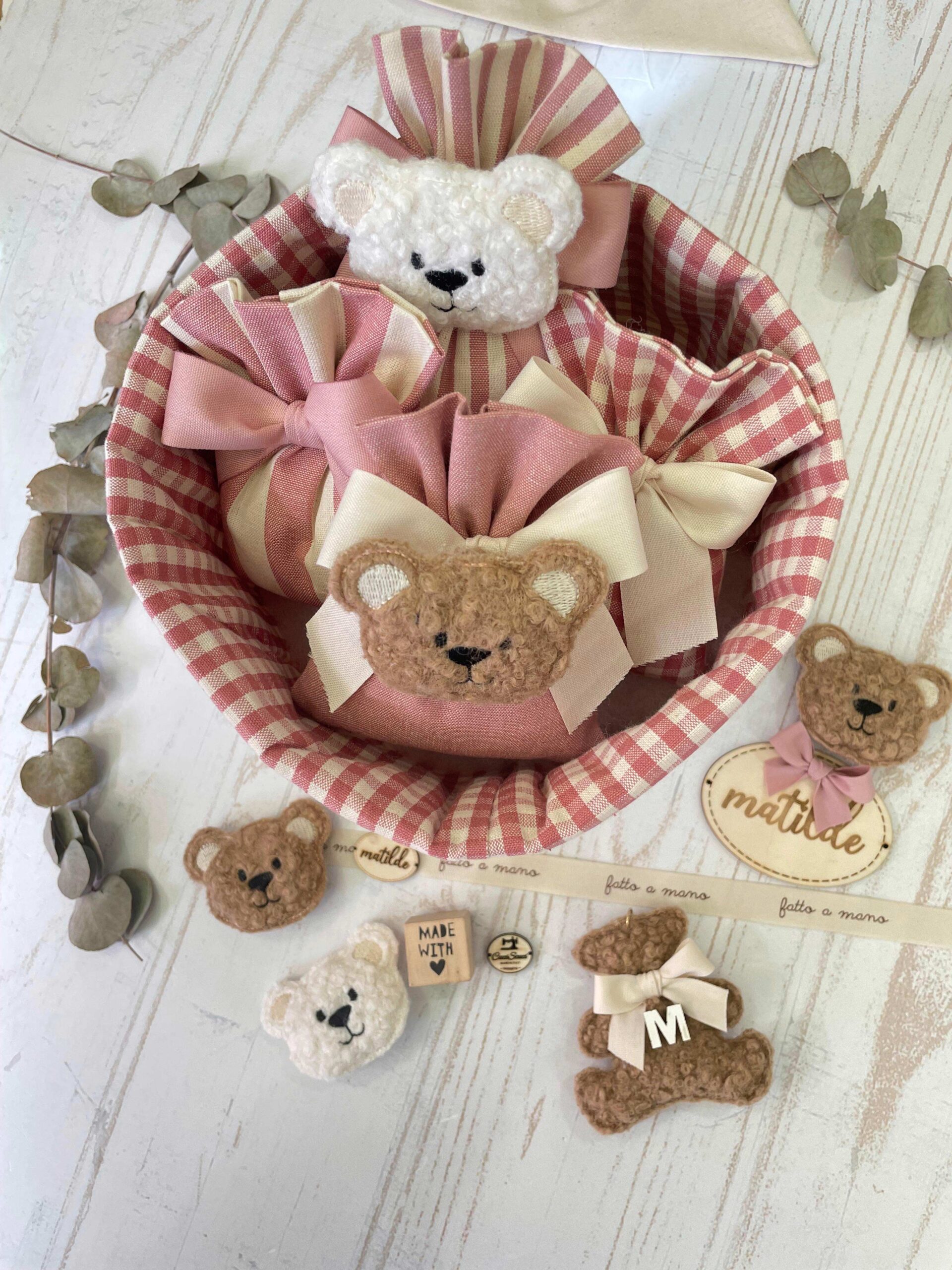 Realizzato con cotone tinto filo in fantasie assortite, o a scelta, nei toni rosa antico e del panna, con l’applicazione di una targhetta in legno personalizzata o di un orsetto in tessuto bouclè.