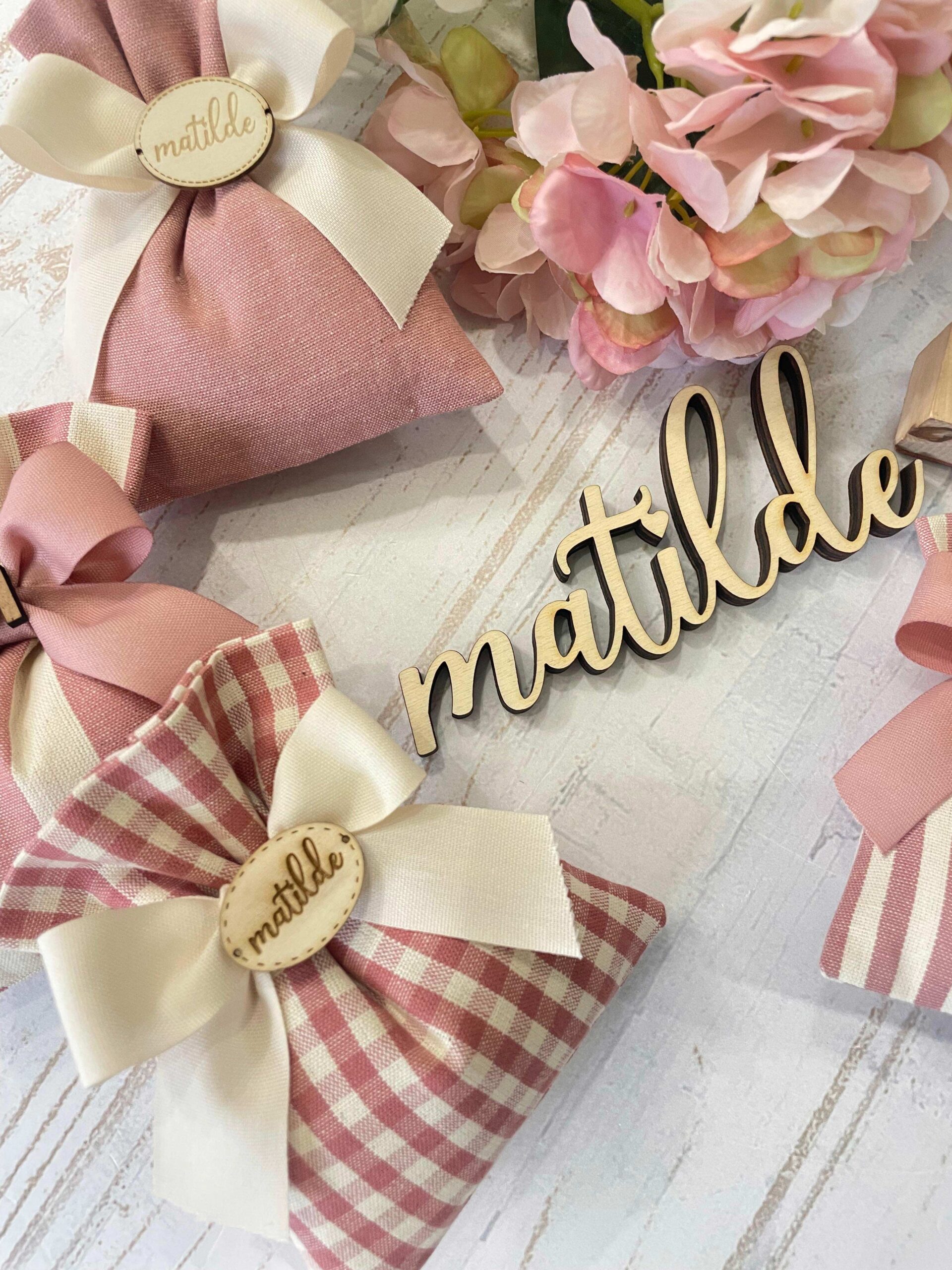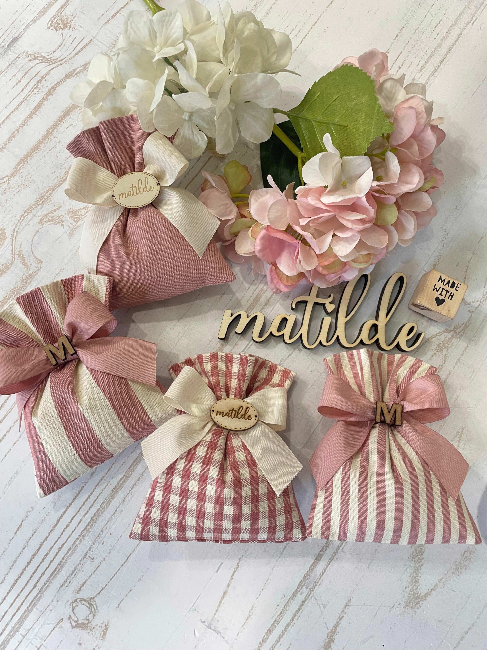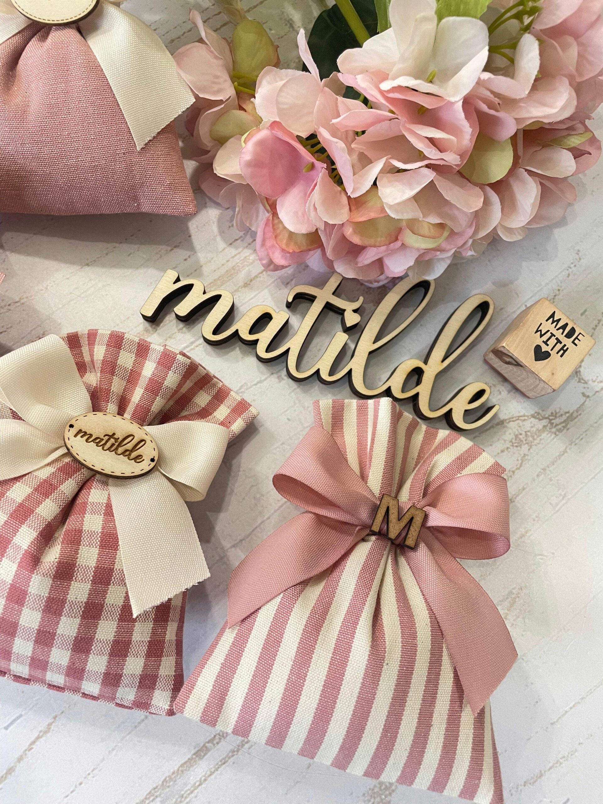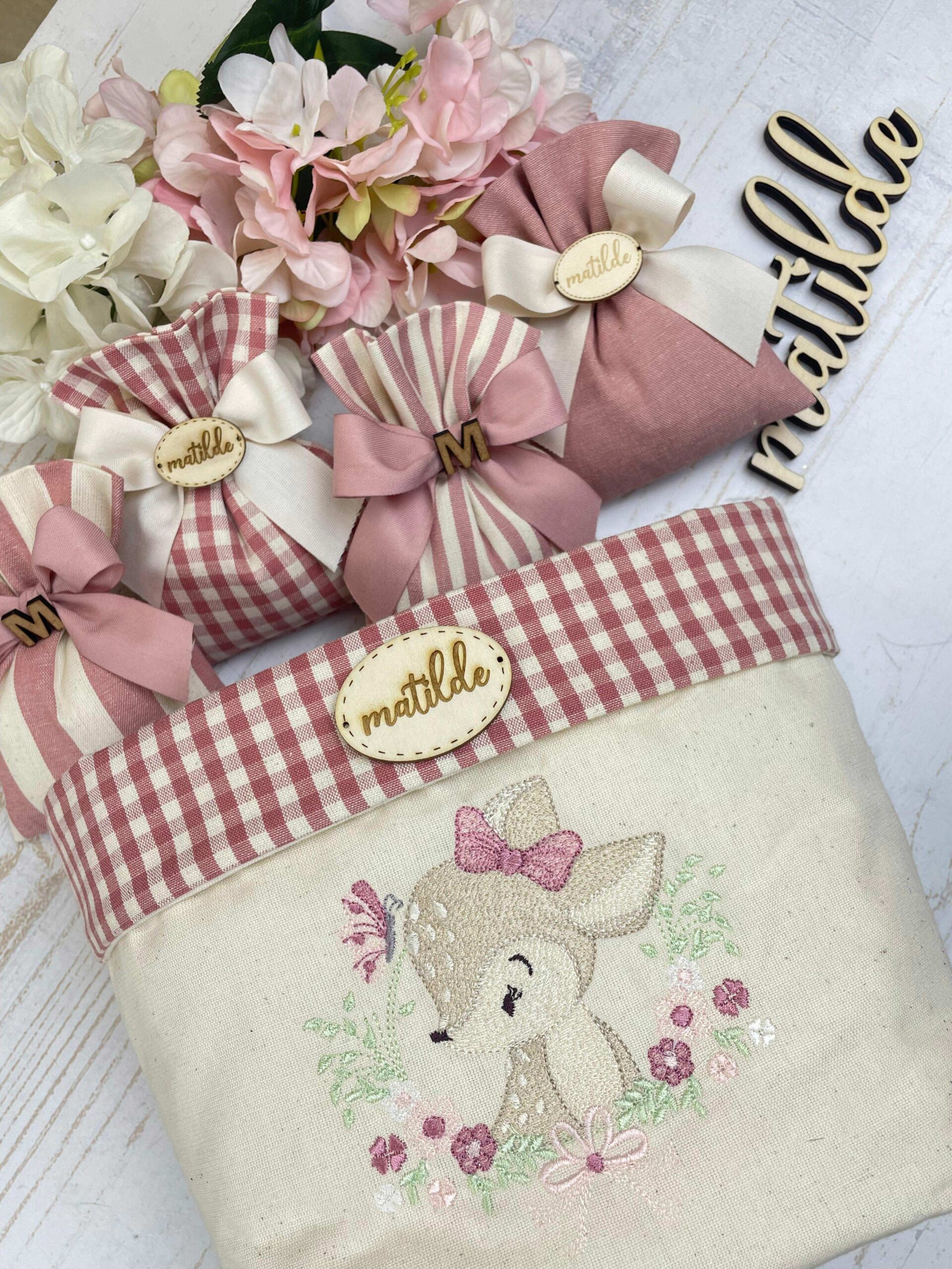 Realizzato con cotone tinto filo in fantasie assortite, o a scelta, nei toni rosa antico e del panna, con l’applicazione di una targhetta in legno personalizzata o di un orsetto in tessuto bouclè.
