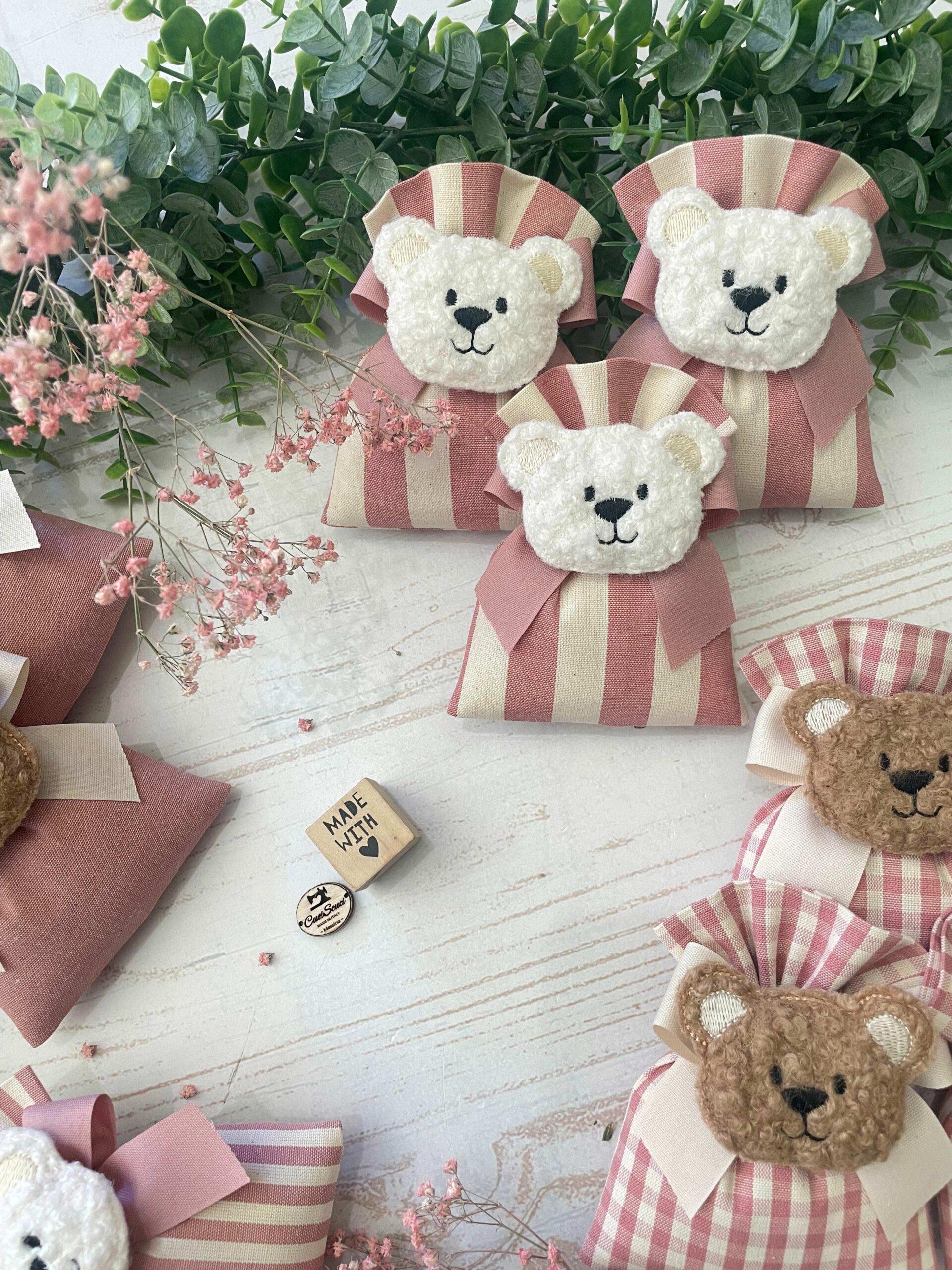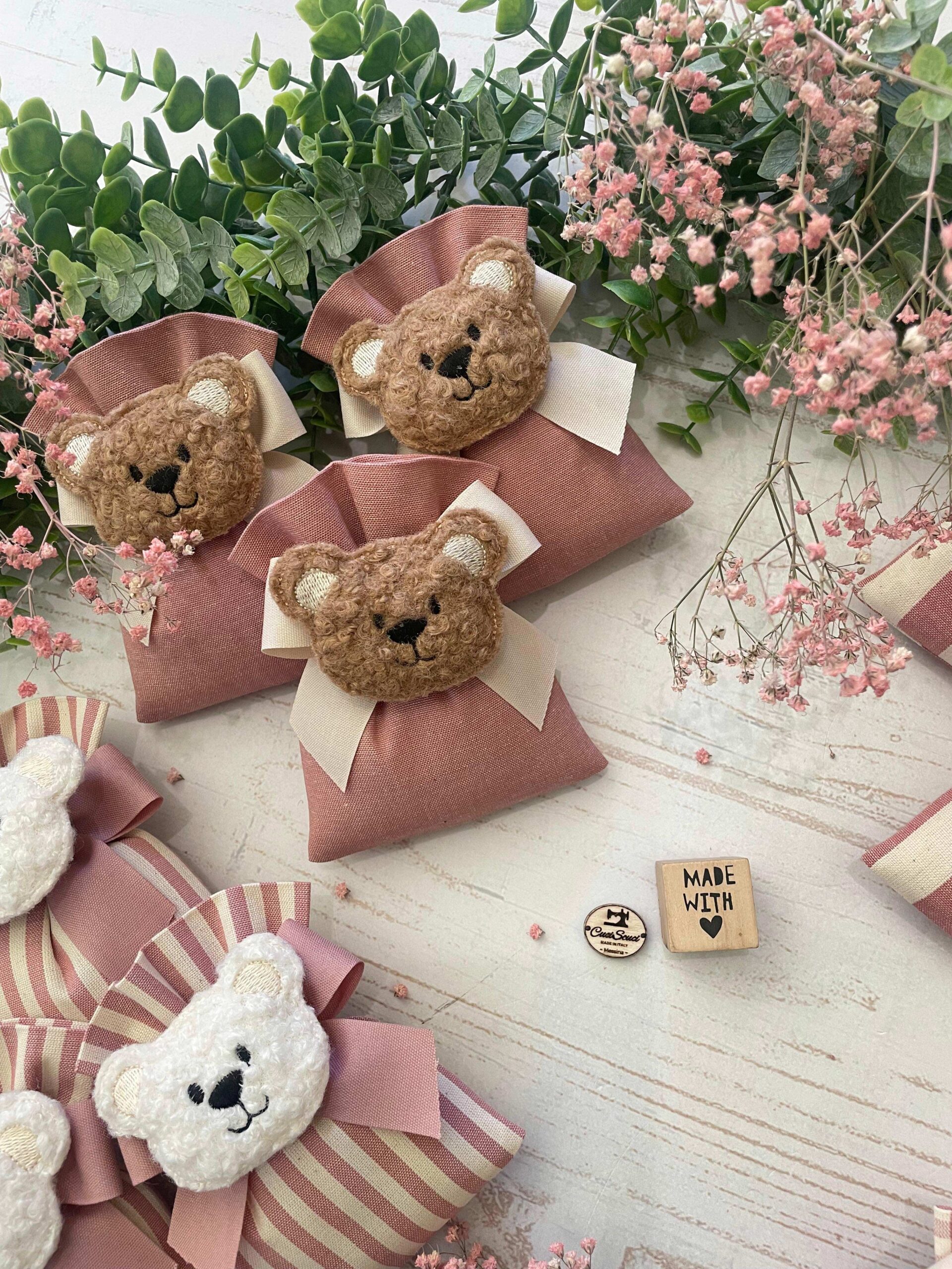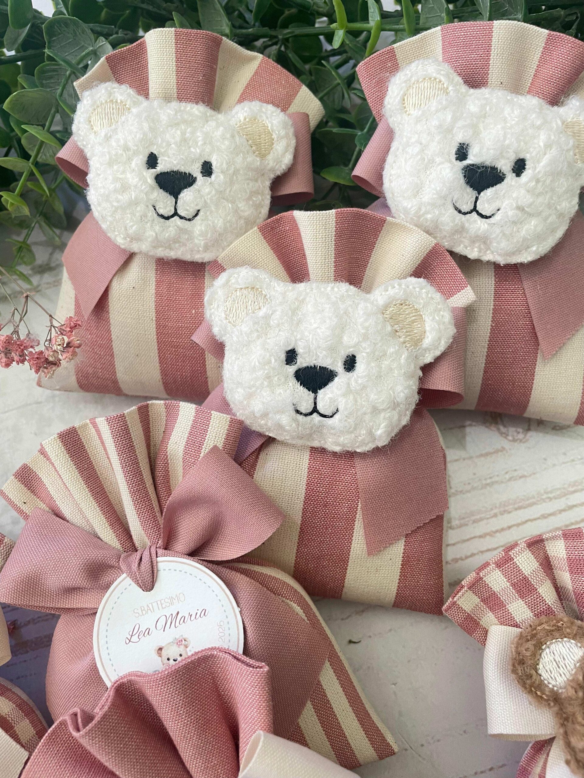 La bomboniera, pronta da donare ai tuoi ospiti, comprende il sacchetto, confezionato con imbottitura in ovatta, fiocco abbinato, 5 confetti in busta sigillata e targhetta in legno personalizzata o orsetto.