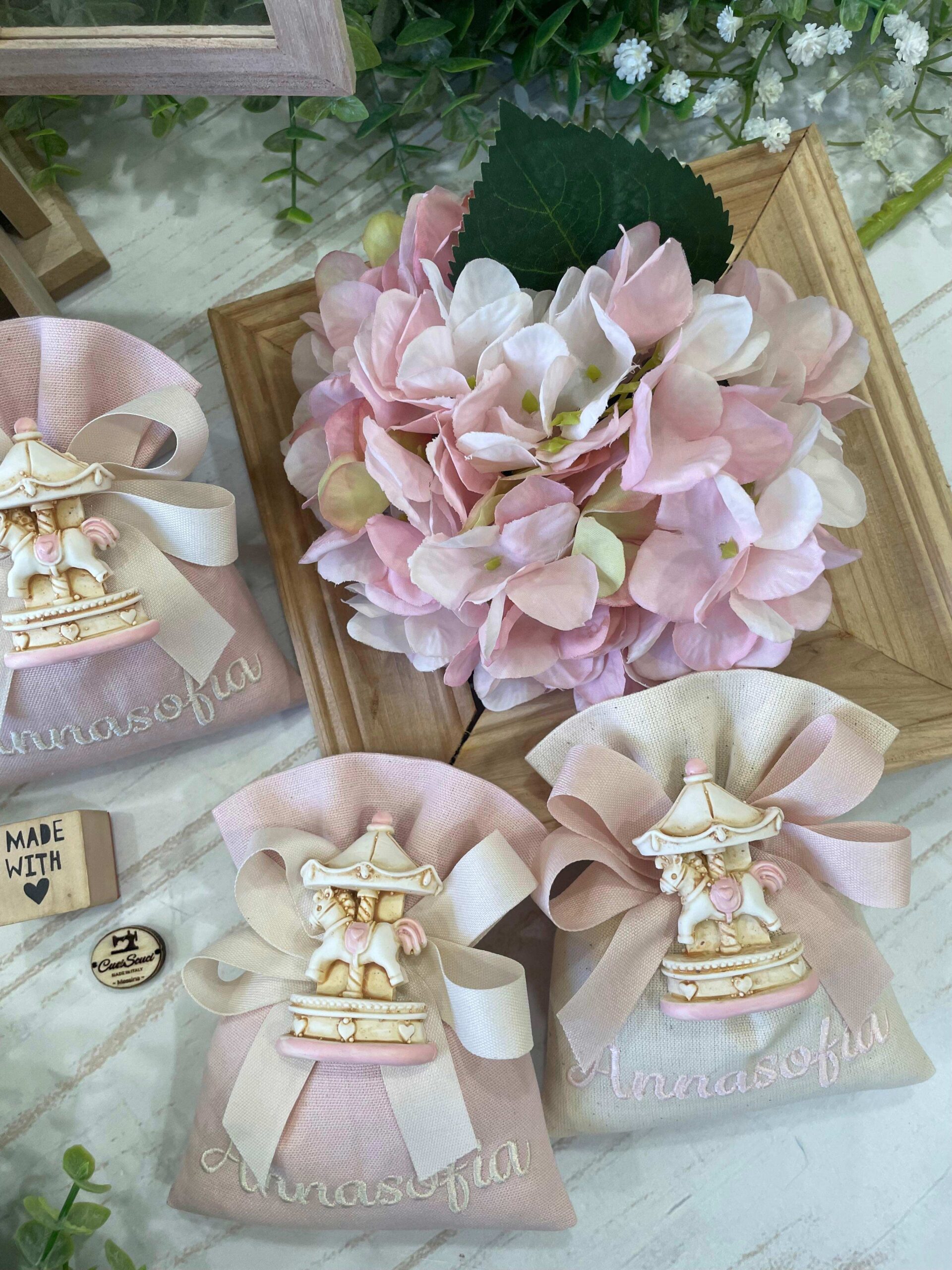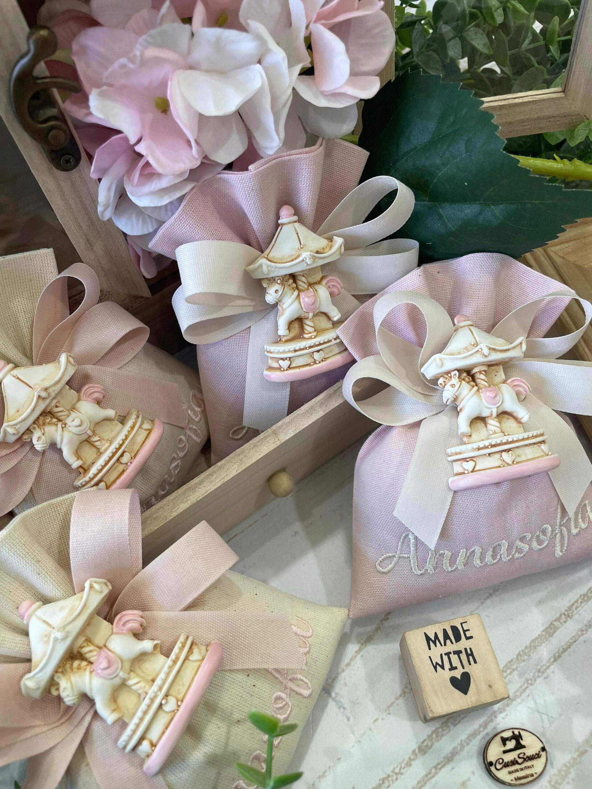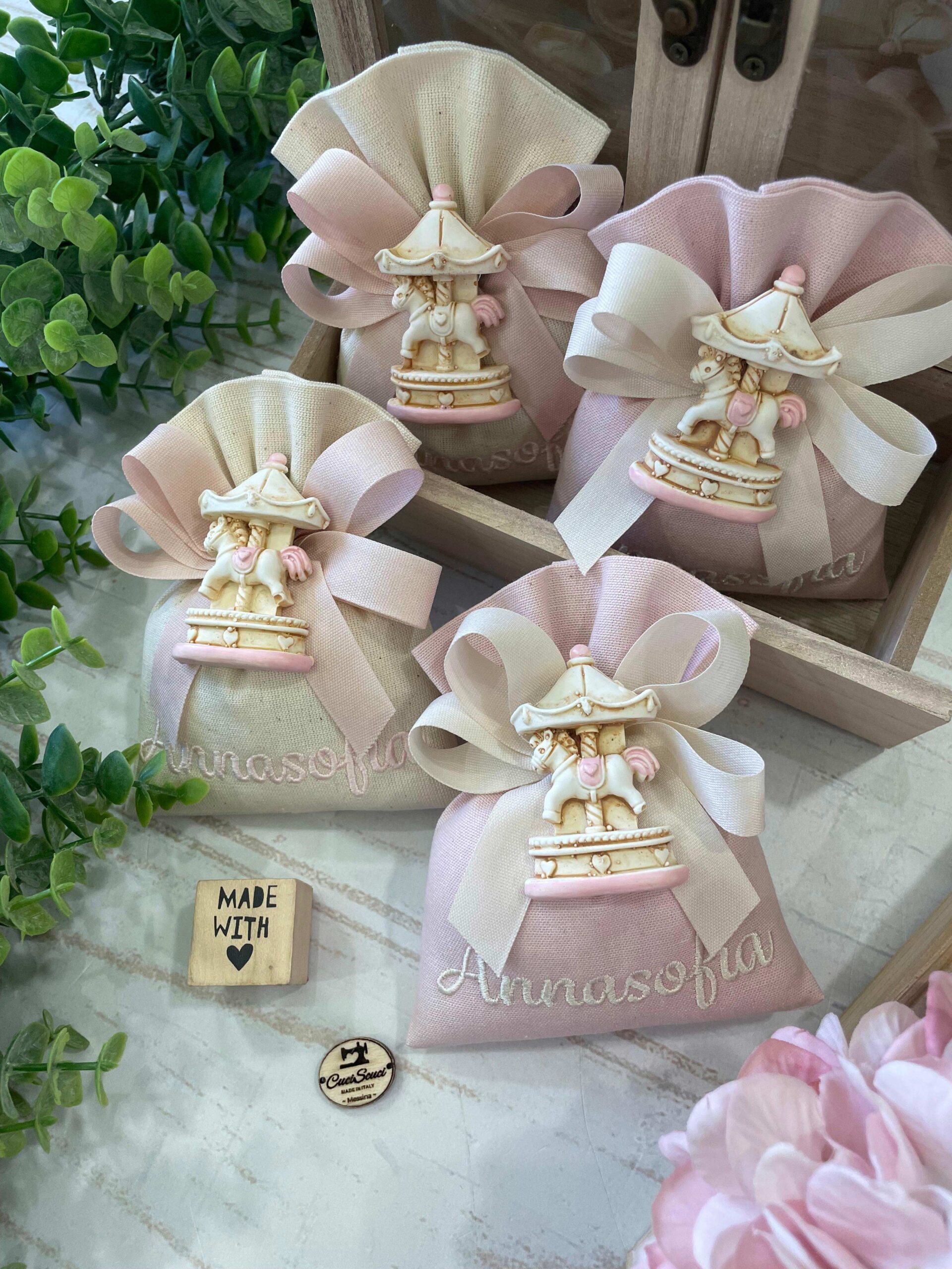 Recensisci per primo “Sacchetto Sartoriale Rosa Cipria e Panna con Ricamo Nome e Calamita Giostrina”