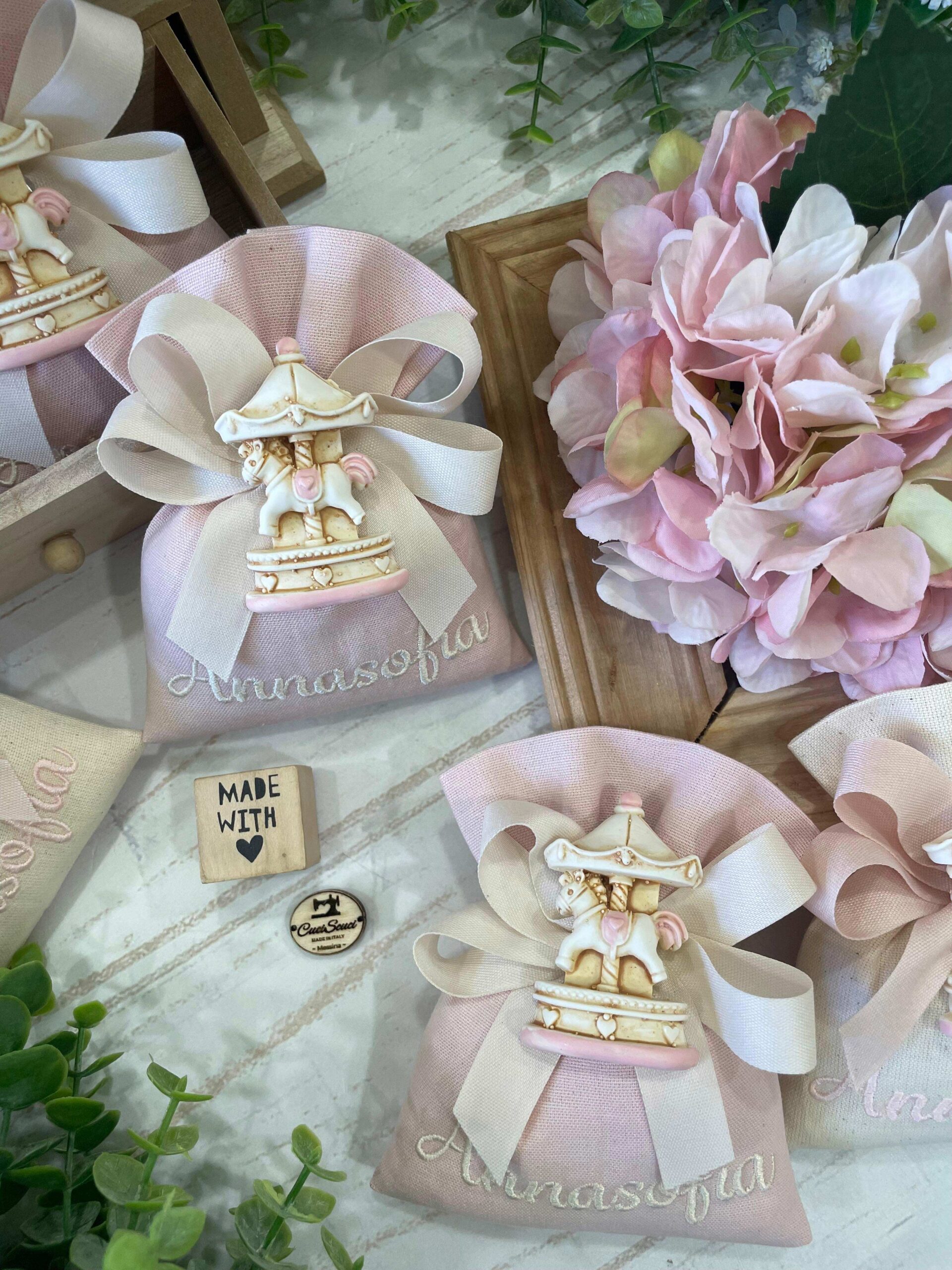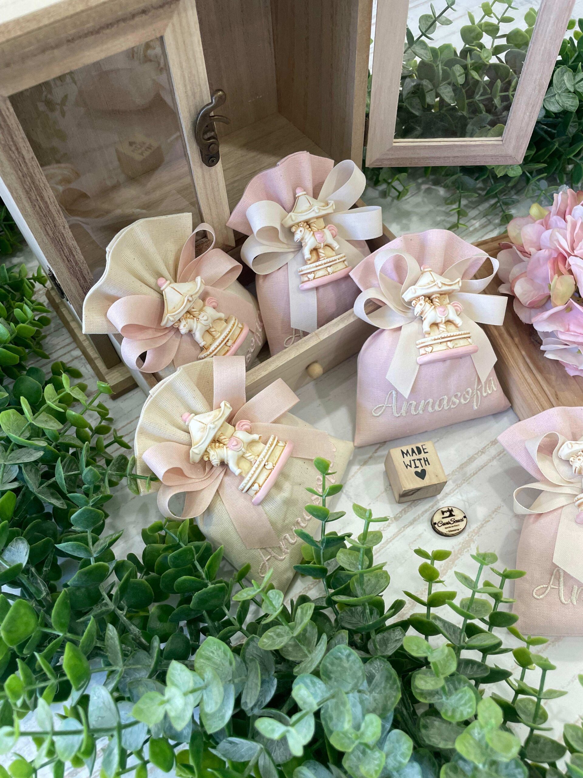 Realizzato con cotone tinto filo in 2 fantasie assortite (o a scelta) nei toni del rosa cipria e del panna, con il ricamo di un nome e l’applicazione di una calamita giostrina antichizzata nei toni del rosa.