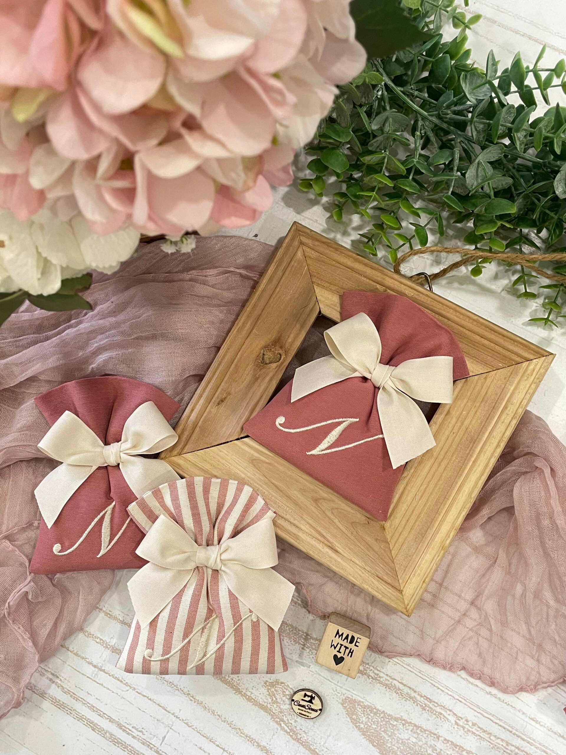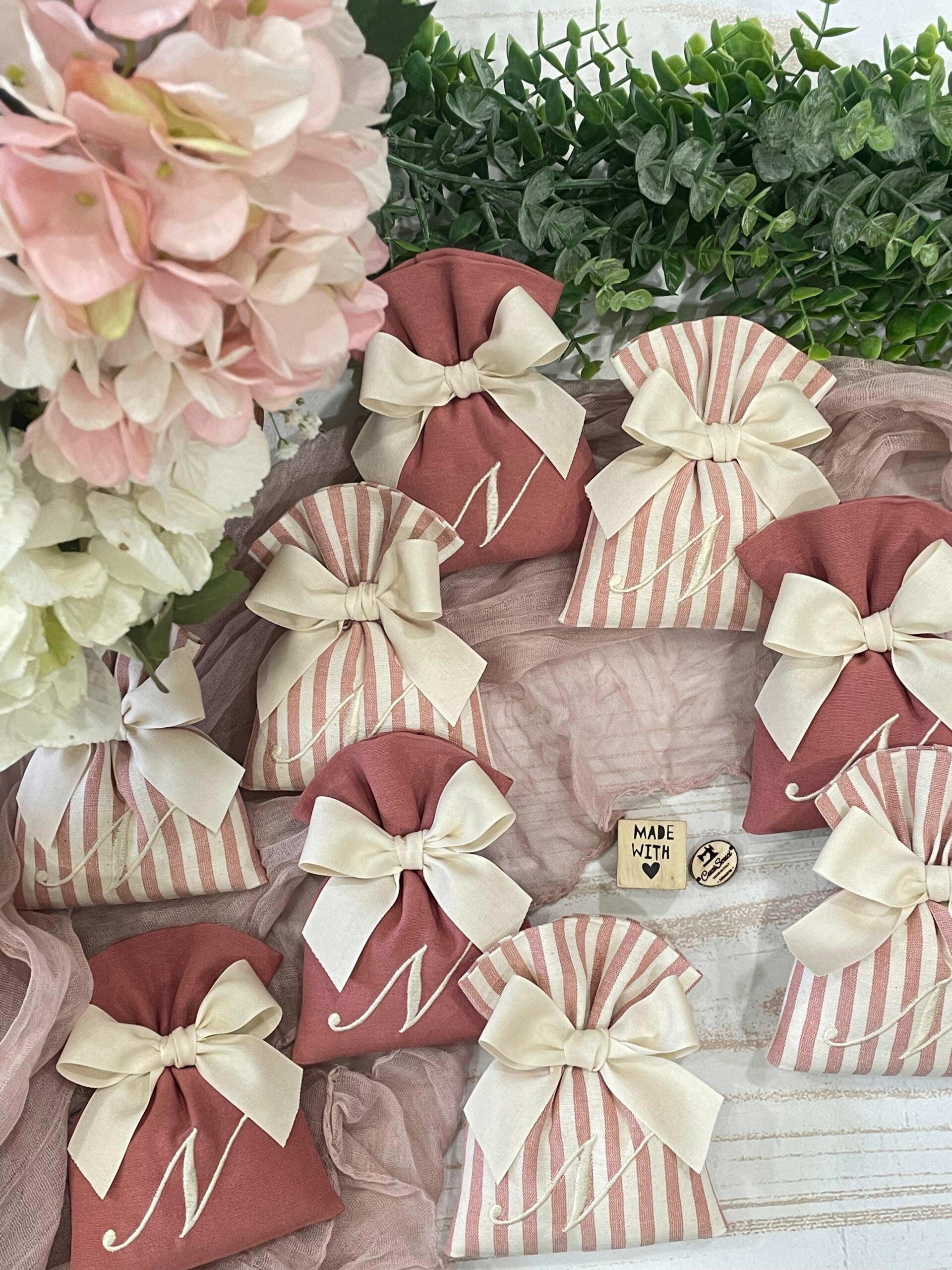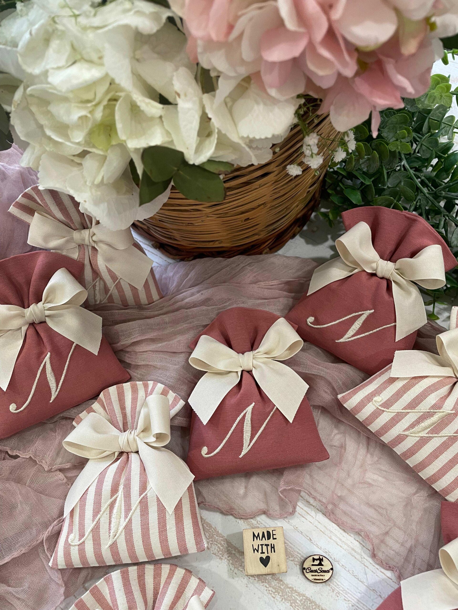 La bomboniera, pronta da donare ai tuoi ospiti, comprende il sacchetto con ricamo, confezionato con imbottitura in ovatta, fiocco abbinato e 5 confetti in busta sigillata.