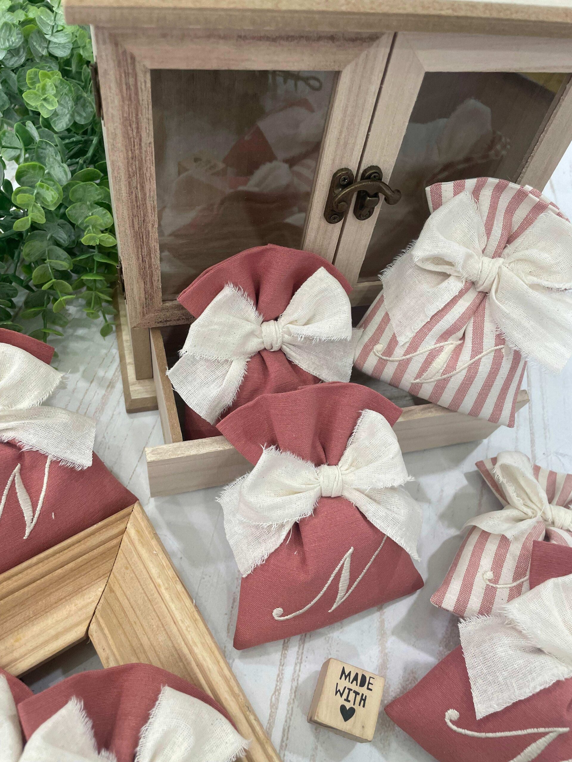 Realizzato con cotone tinto filo rodas colore terracotta e panna, con il ricamo di un’iniziale.