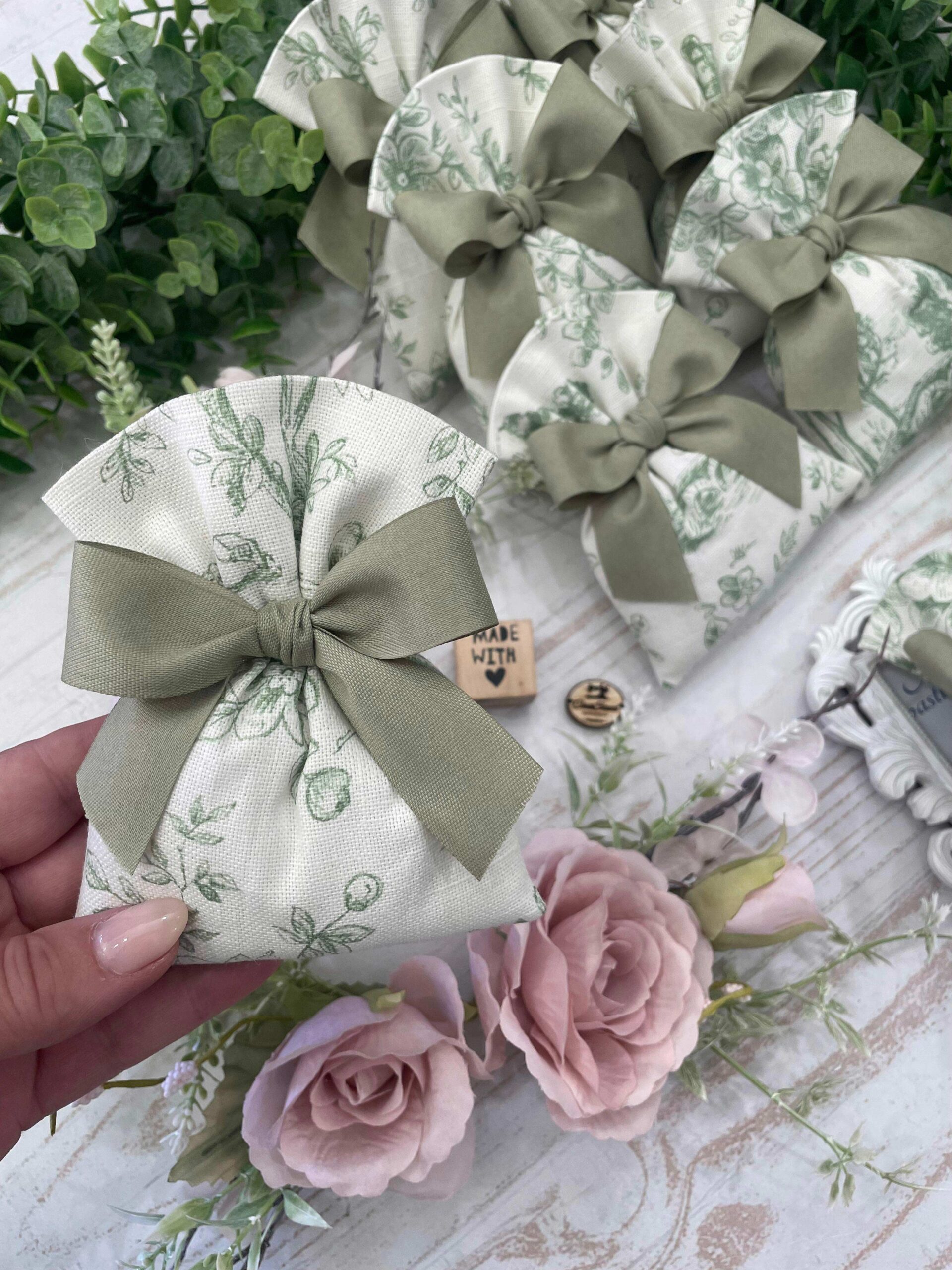 La bomboniera, pronta da donare ai tuoi ospiti, comprende il sacchetto, confezionato con imbottitura in ovatta, fiocco abbinato, 5 confetti in busta sigillata.