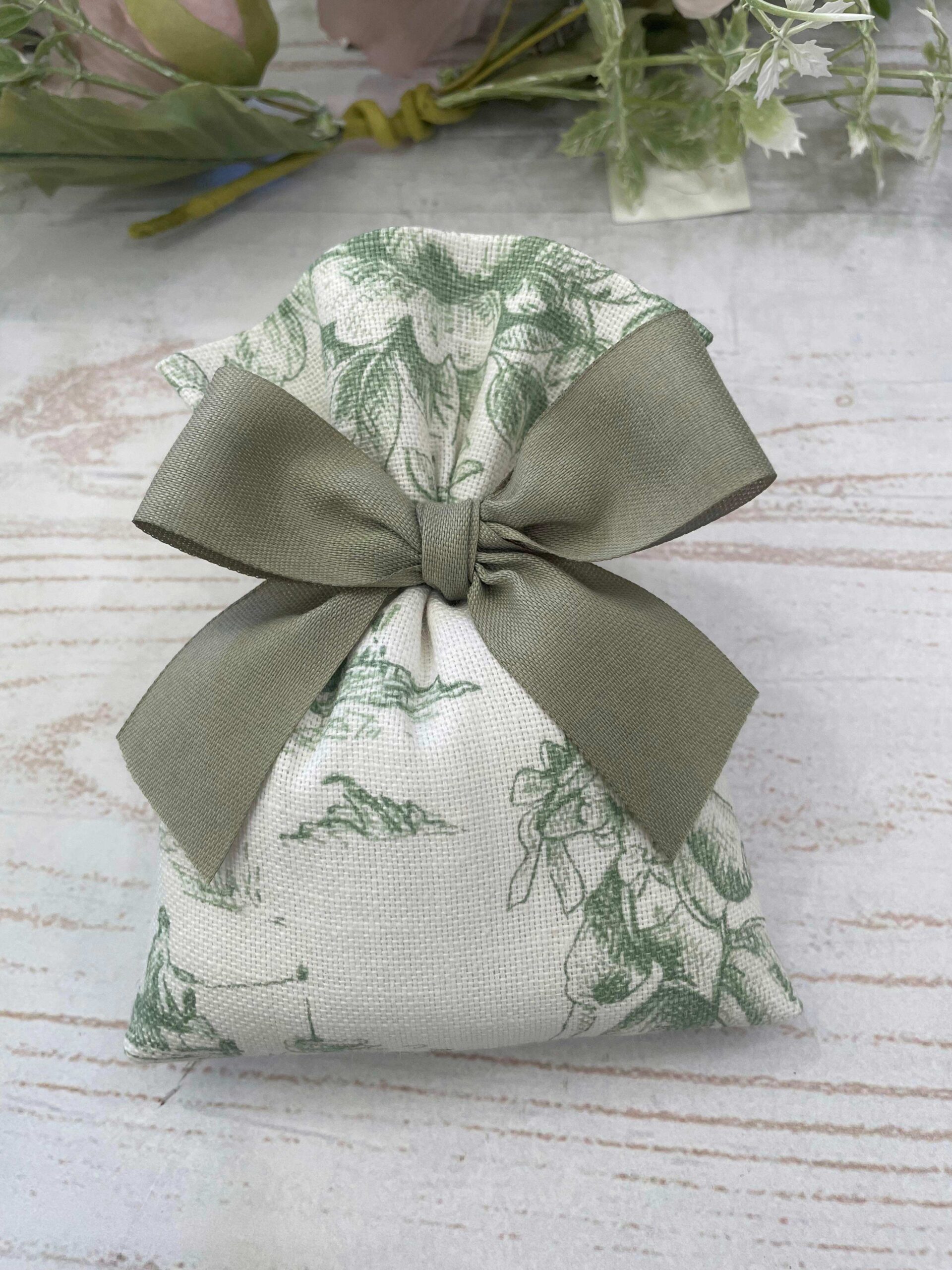 Realizzato con tessuto toile de jouy nei toni del verde e del panna.