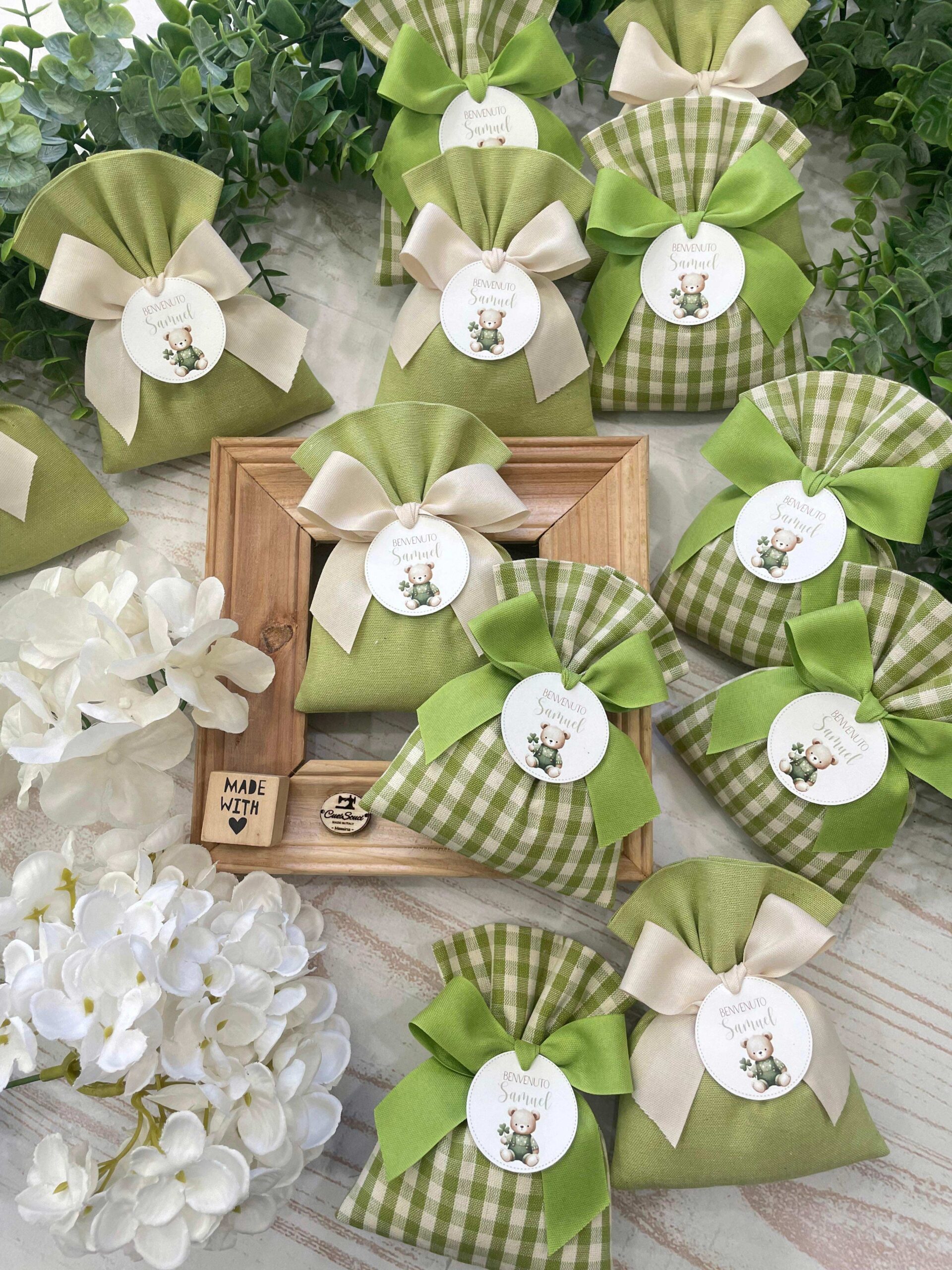 La bomboniera, pronta da donare ai tuoi ospiti, comprende il sacchetto, confezionato con imbottitura in ovatta, fiocco abbinato, 5 confetti in busta sigillata, con o senza tag.