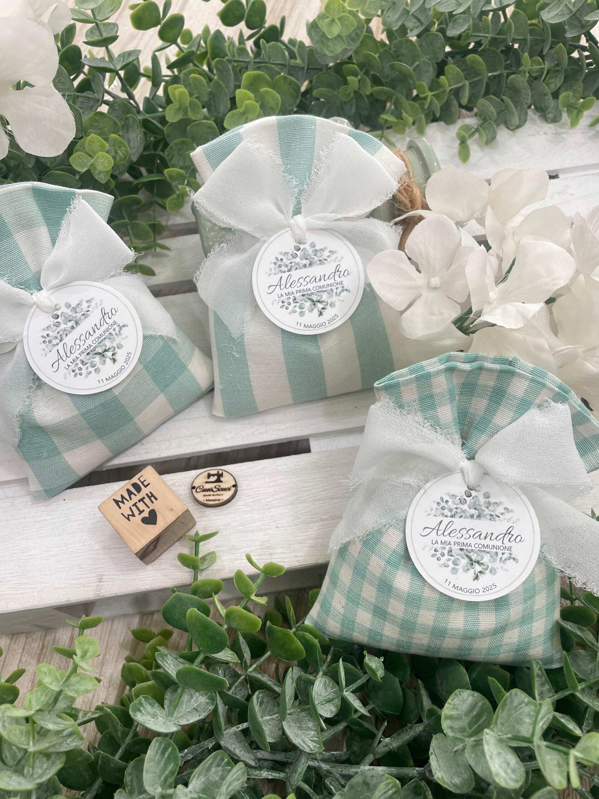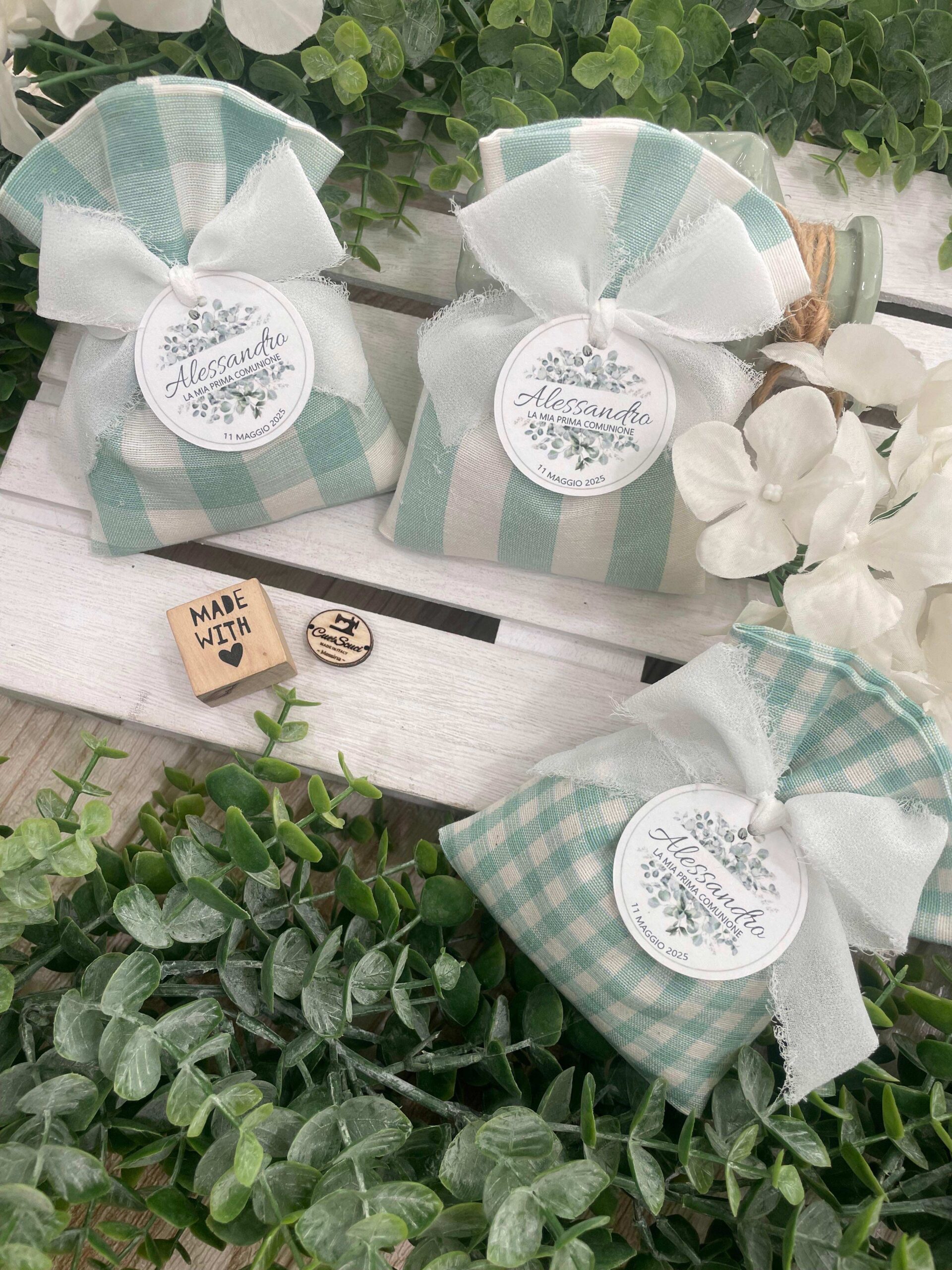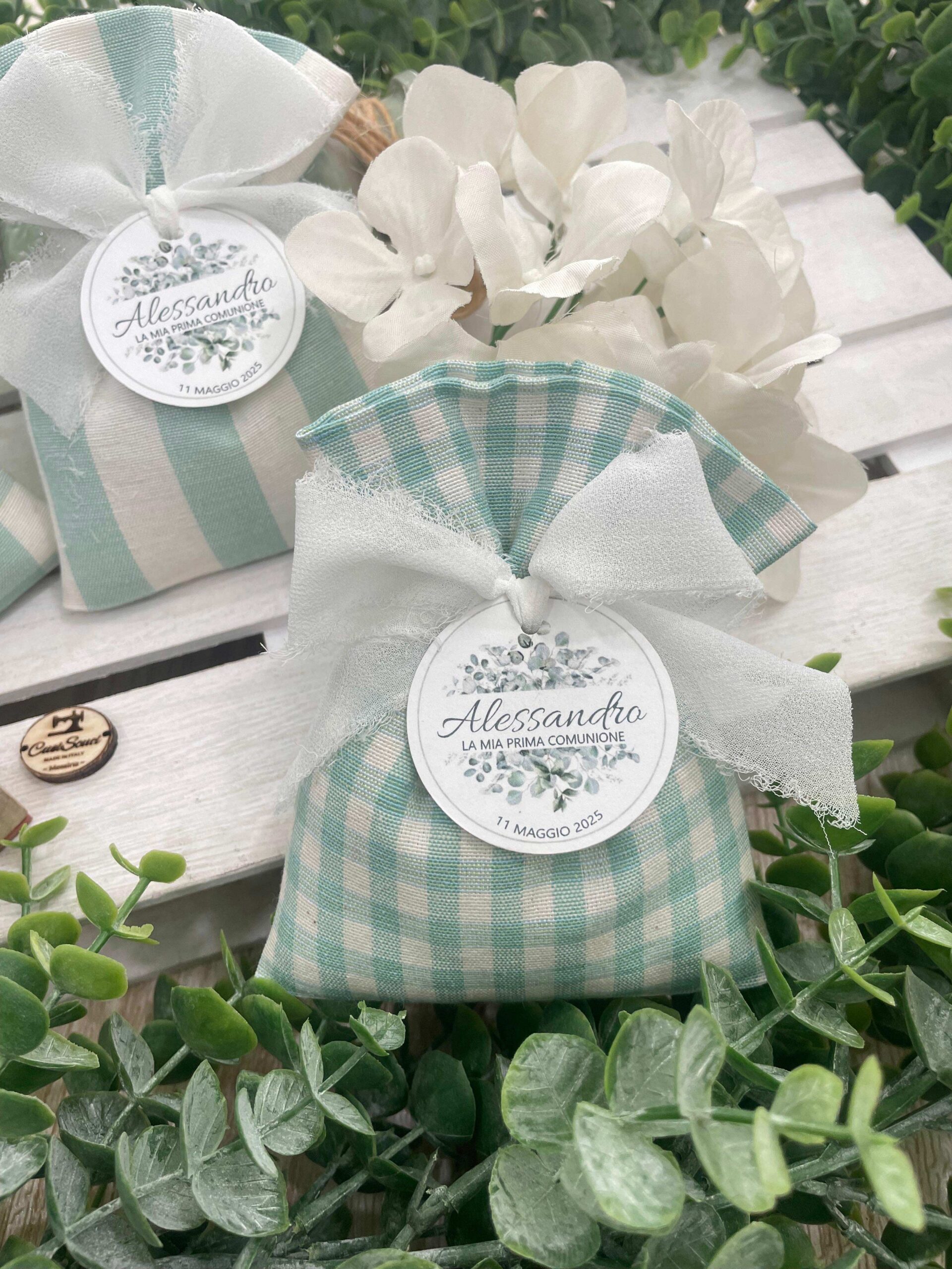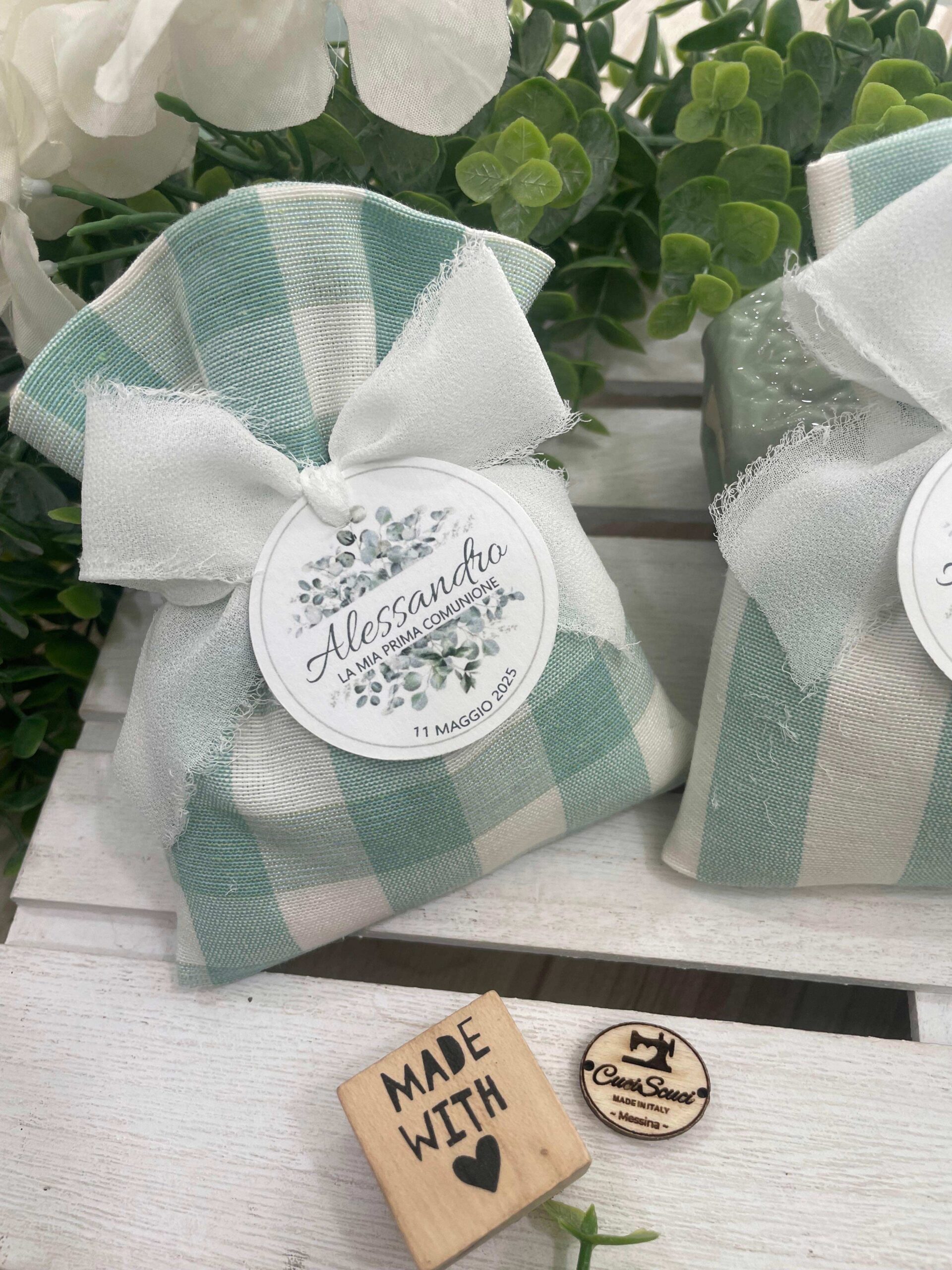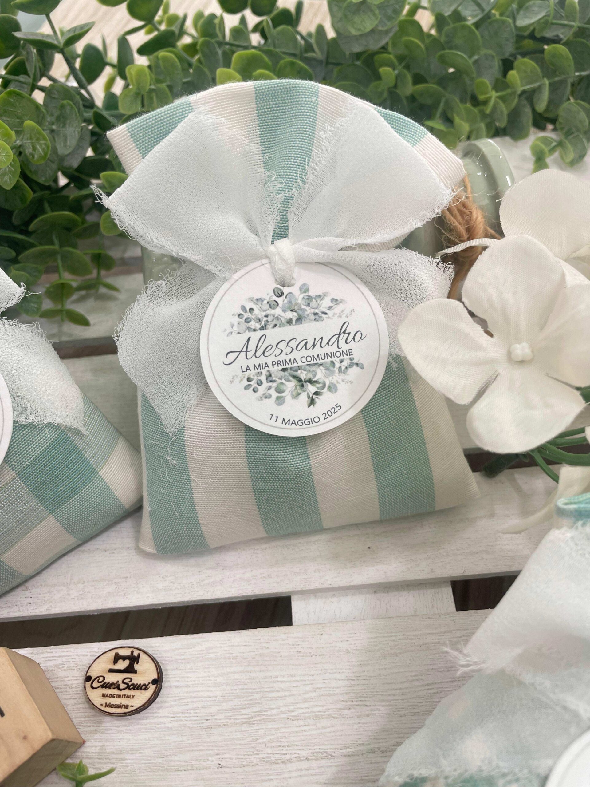 Realizzato con cotone rodas in fantasie assortite (o a scelta) nei toni del verde menta e del panna, con l’applicazione di un tag personalizzato.