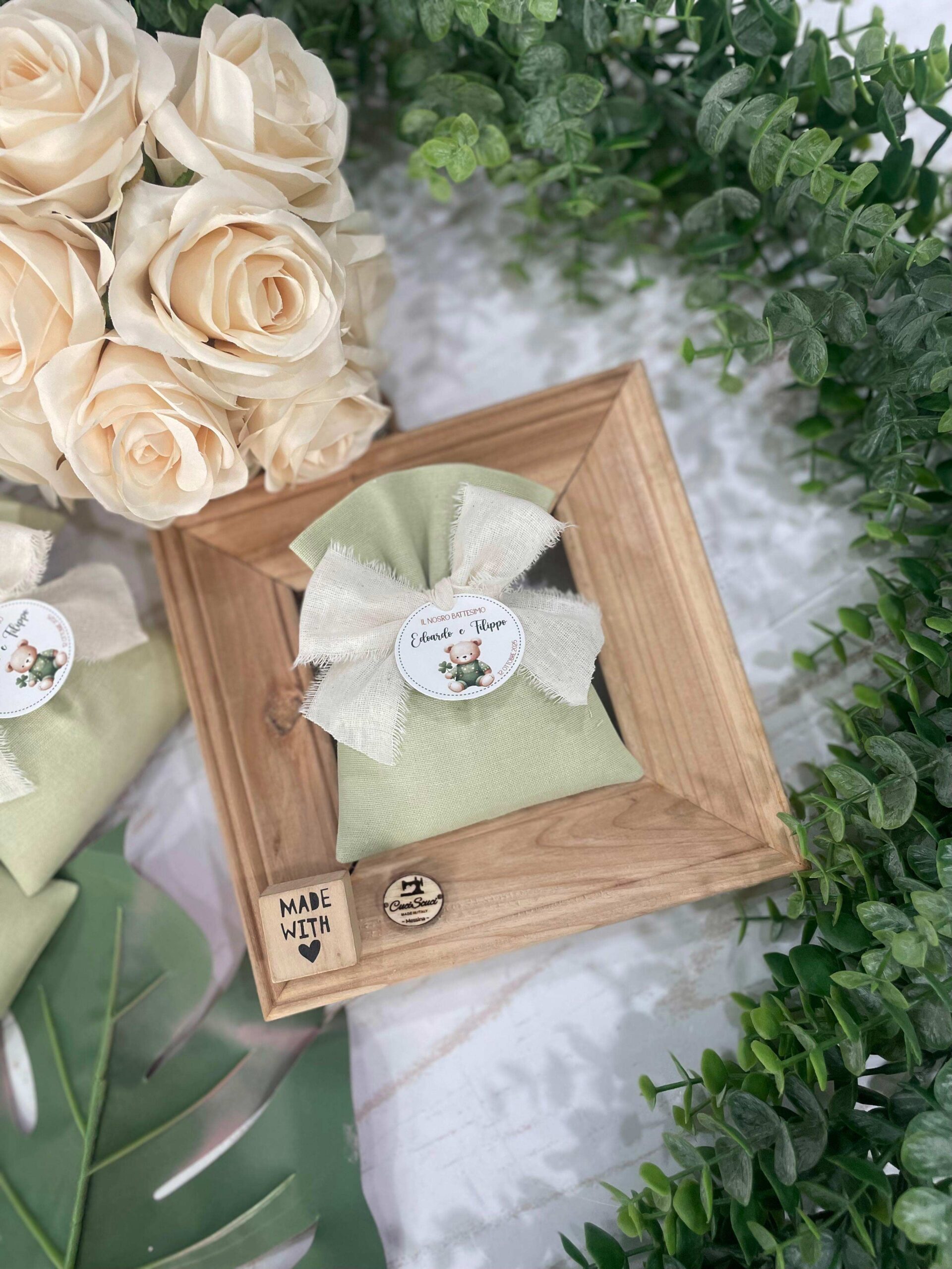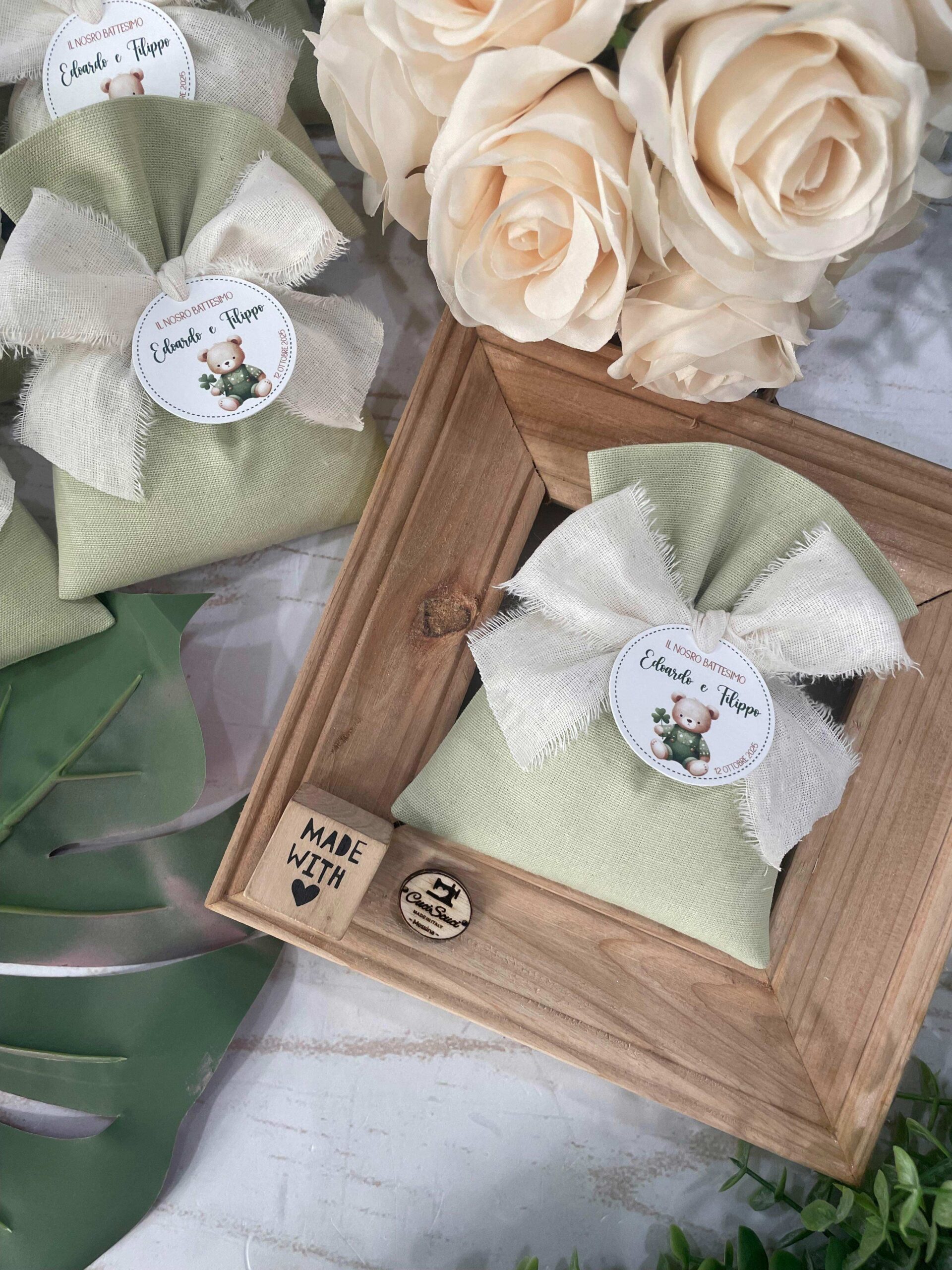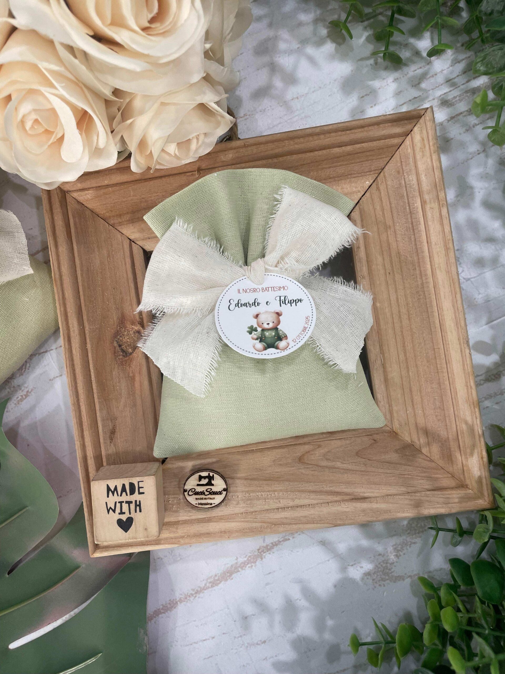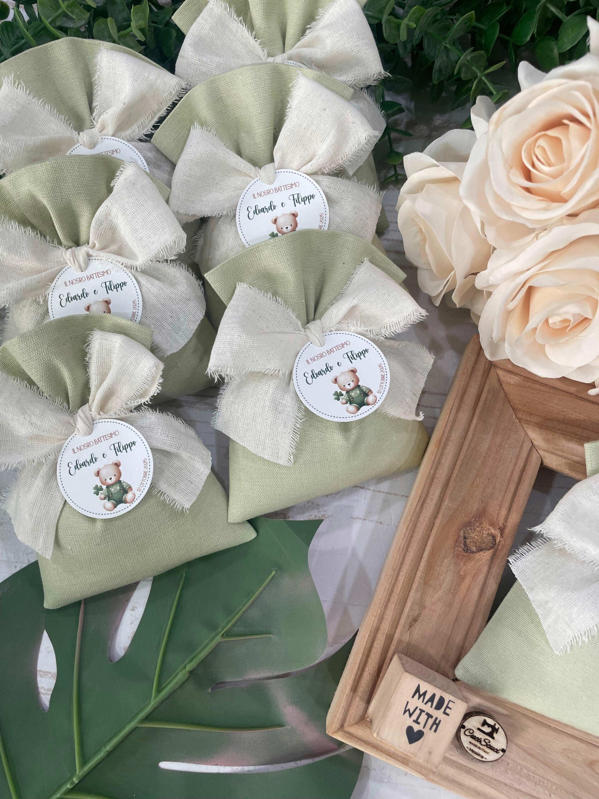 La bomboniera, pronta da donare ai tuoi ospiti, comprende il sacchetto, confezionato con imbottitura in ovatta, fiocco abbinato, 5 confetti in busta sigillata, con o senza tag.