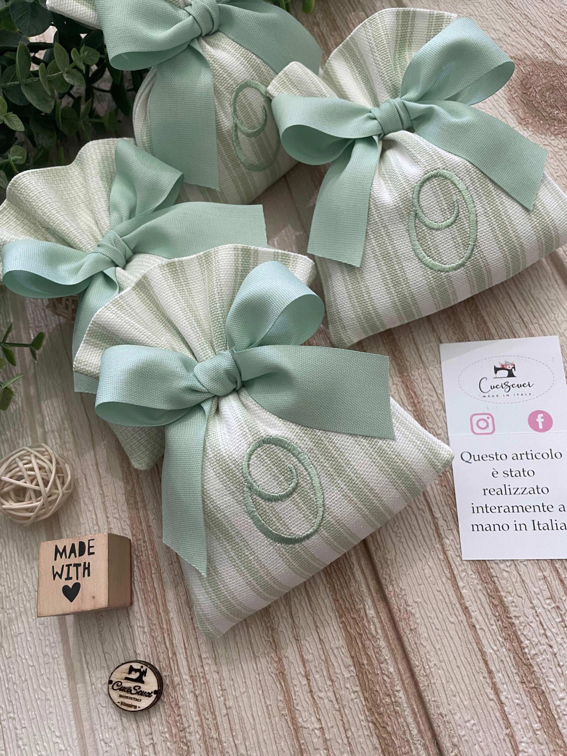 La bomboniera, pronta da donare ai tuoi ospiti, comprende il sacchetto con ricamo, confezionato con imbottitura in ovatta, fiocco abbinato e 5 confetti.