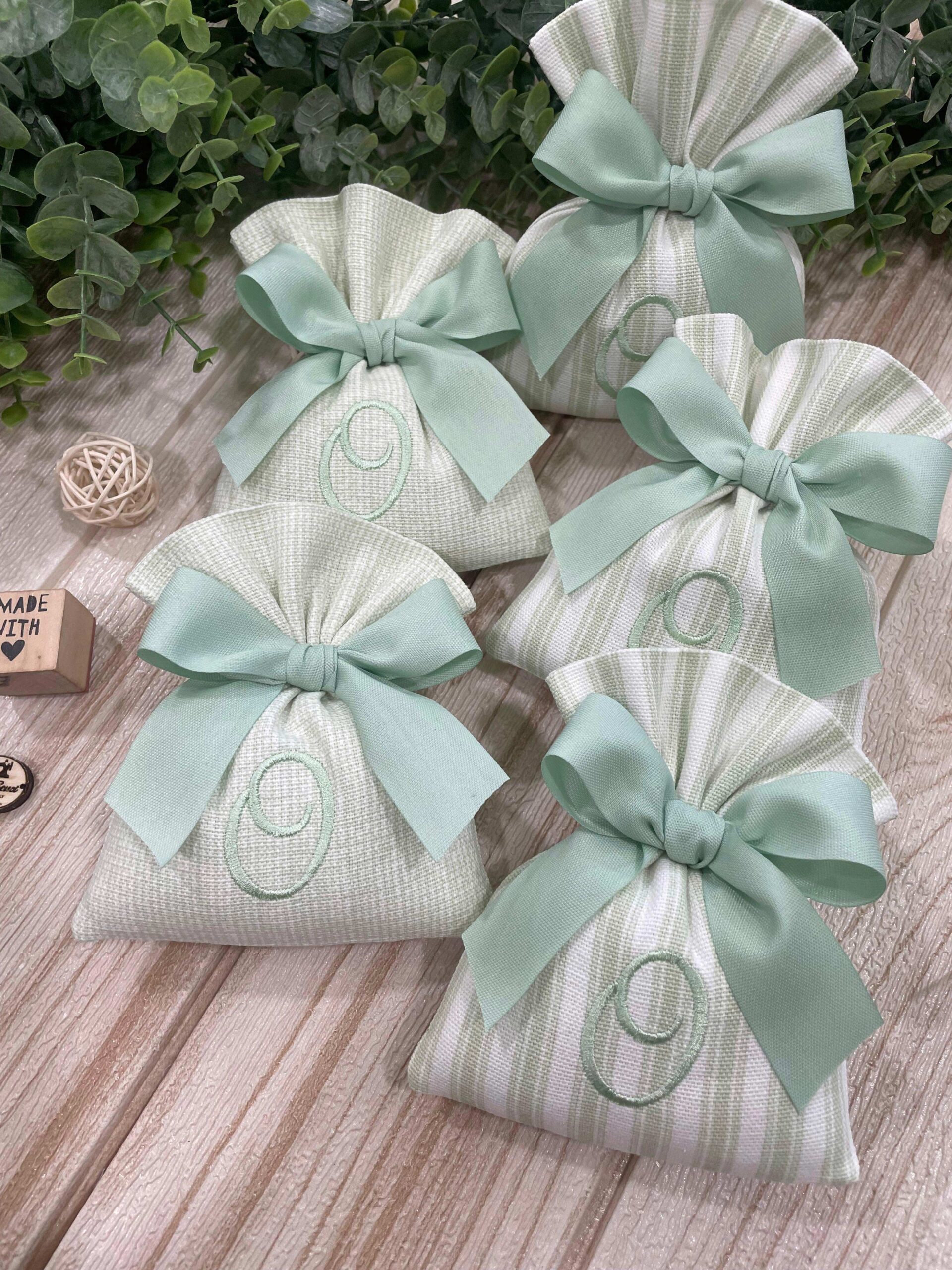 Realizzato con cotone panama in fantasie assortite (o a scelta) nei toni del verde pastello con il ricamo di un’iniziale.
