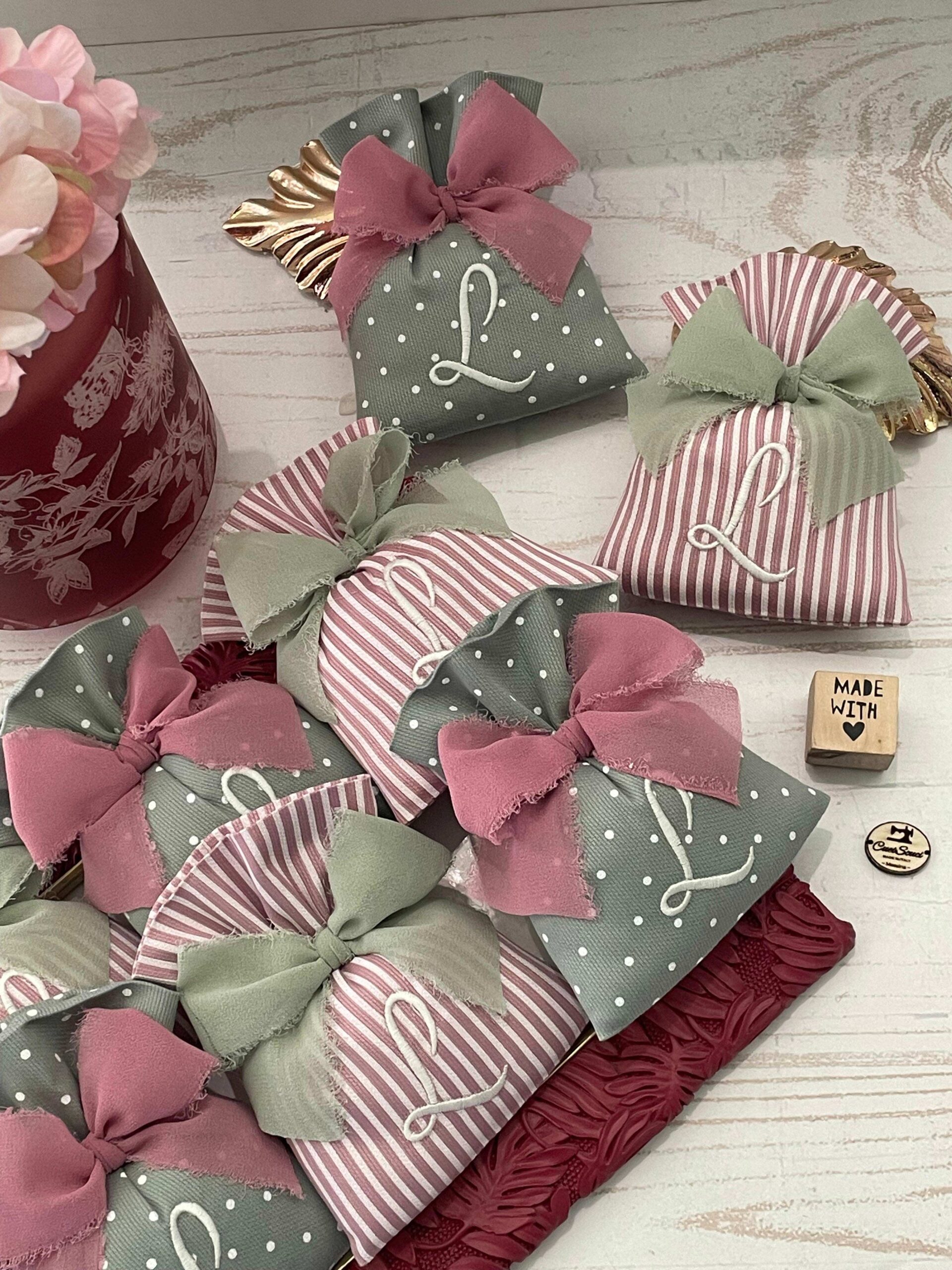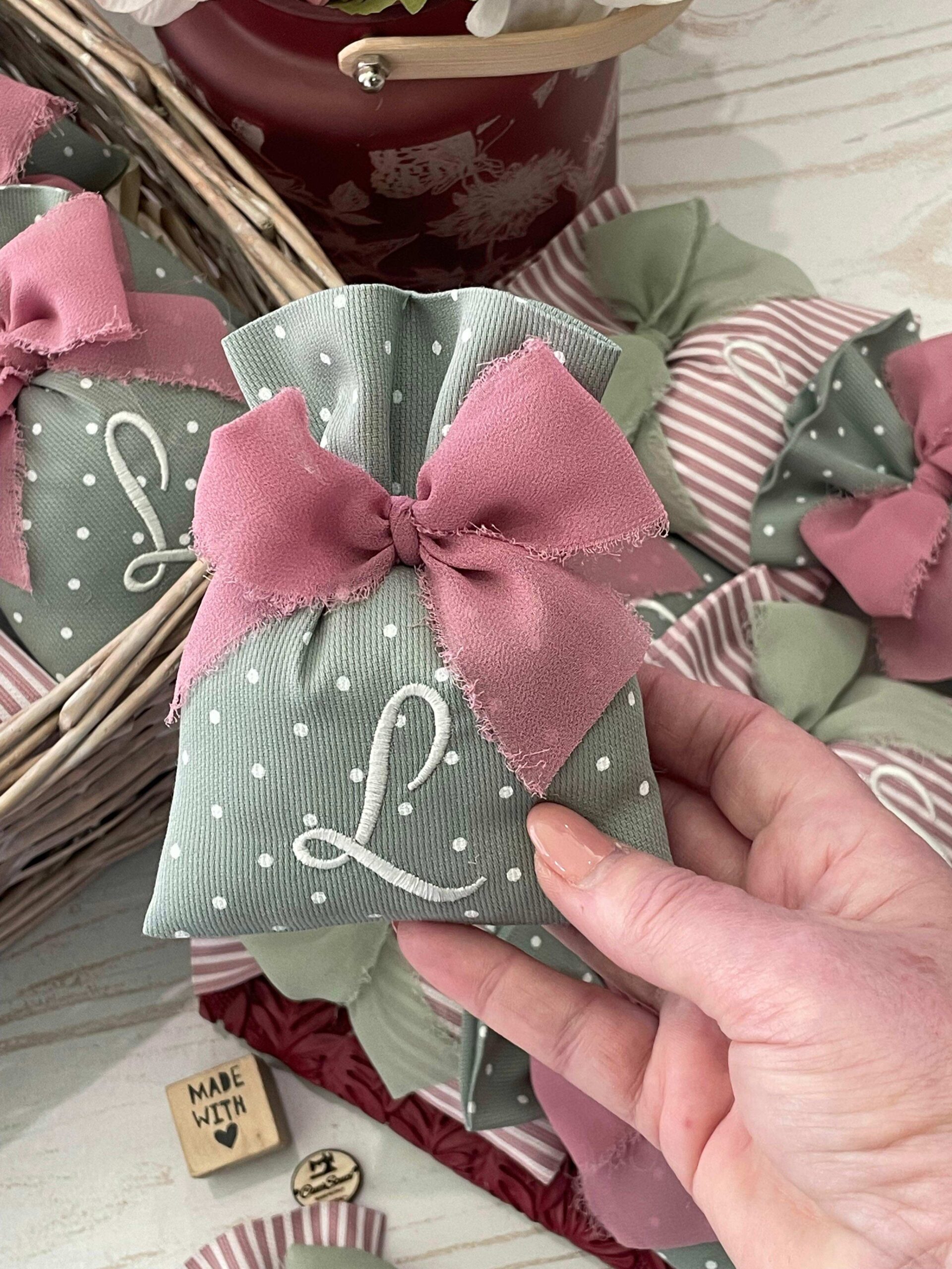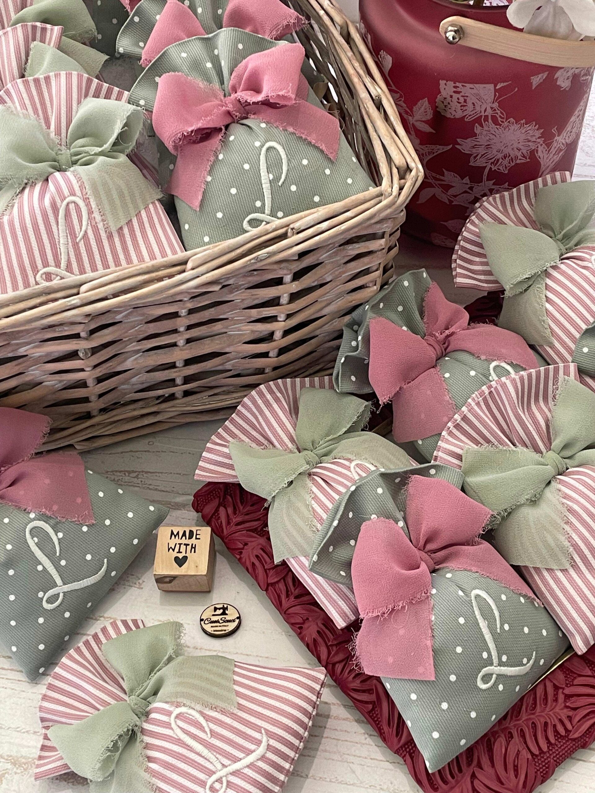 Realizzato con rigatino di cotone in fantasie assortite, o a scelta, nei colori verde salvia e rosa antico, con il ricamo di un’iniziale.