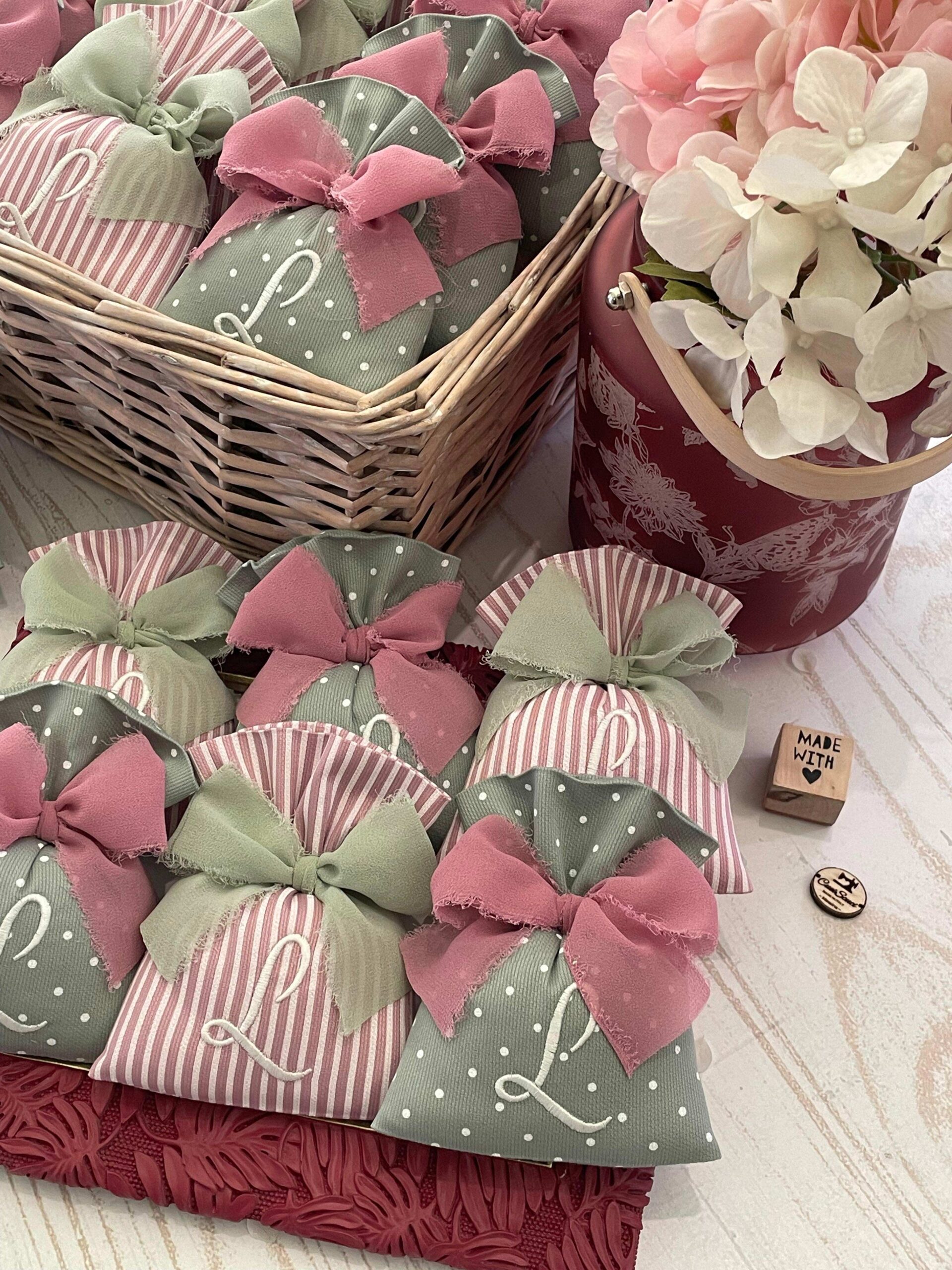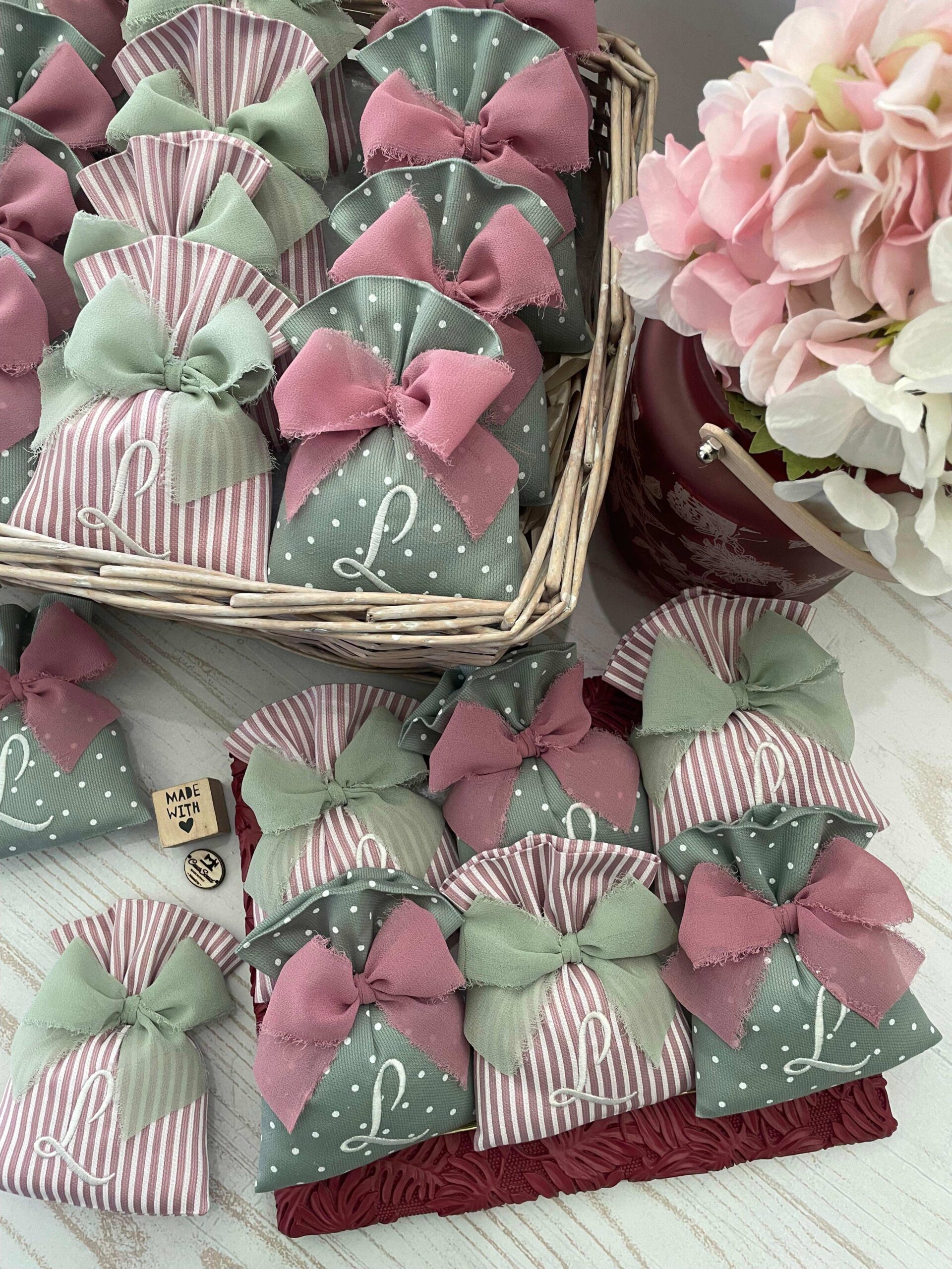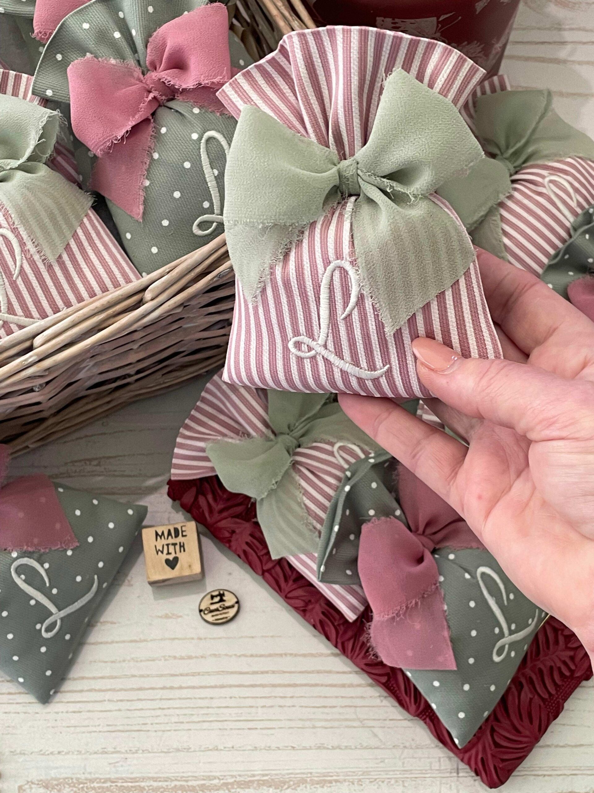 Realizzato con rigatino di cotone in fantasie assortite, o a scelta, nei colori verde salvia e rosa antico, con il ricamo di un’iniziale.