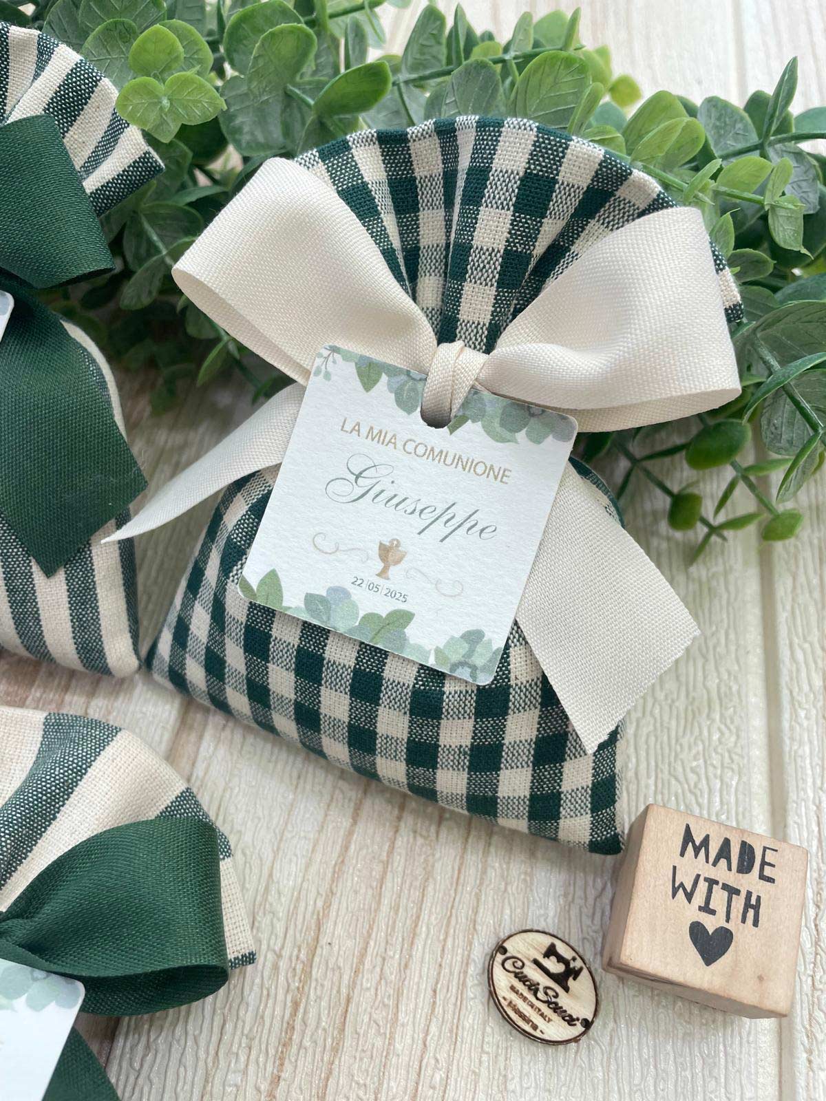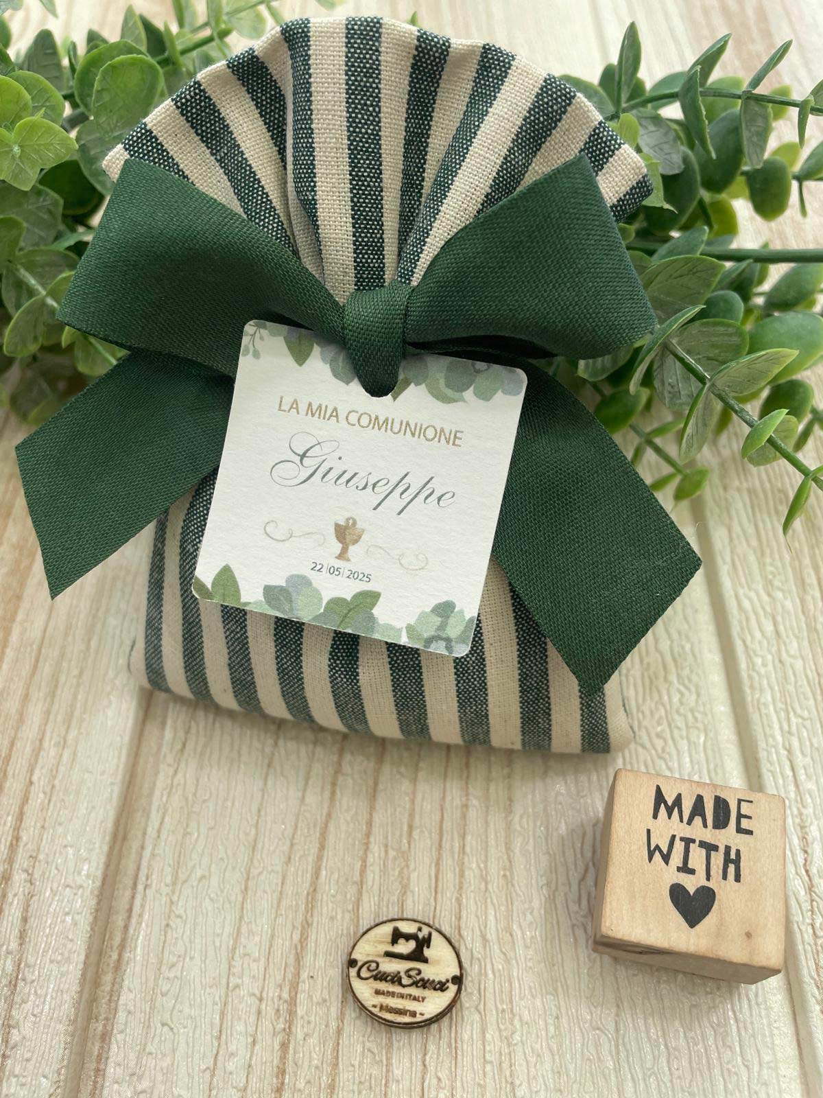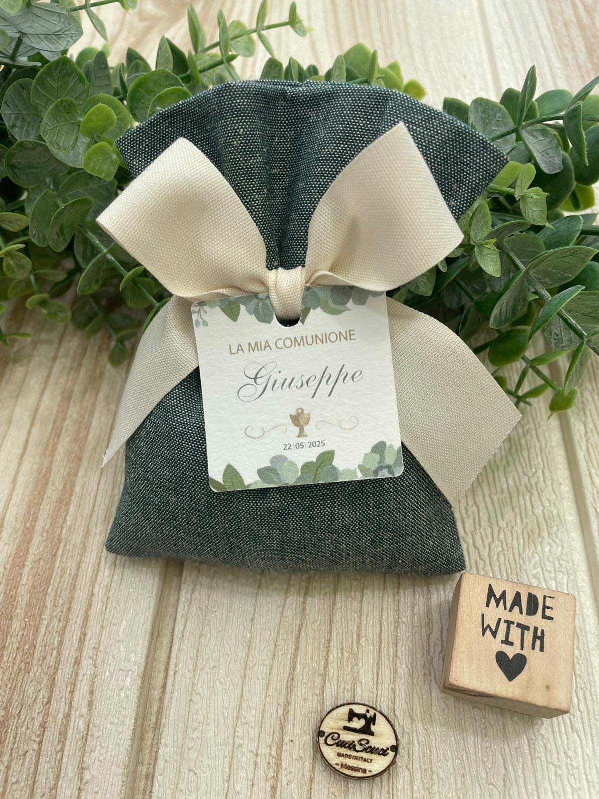La bomboniera, pronta da donare ai tuoi ospiti, comprende il sacchetto, confezionato con imbottitura in ovatta, fiocco abbinato, 5 confetti in busta sigillata, con o senza tag.