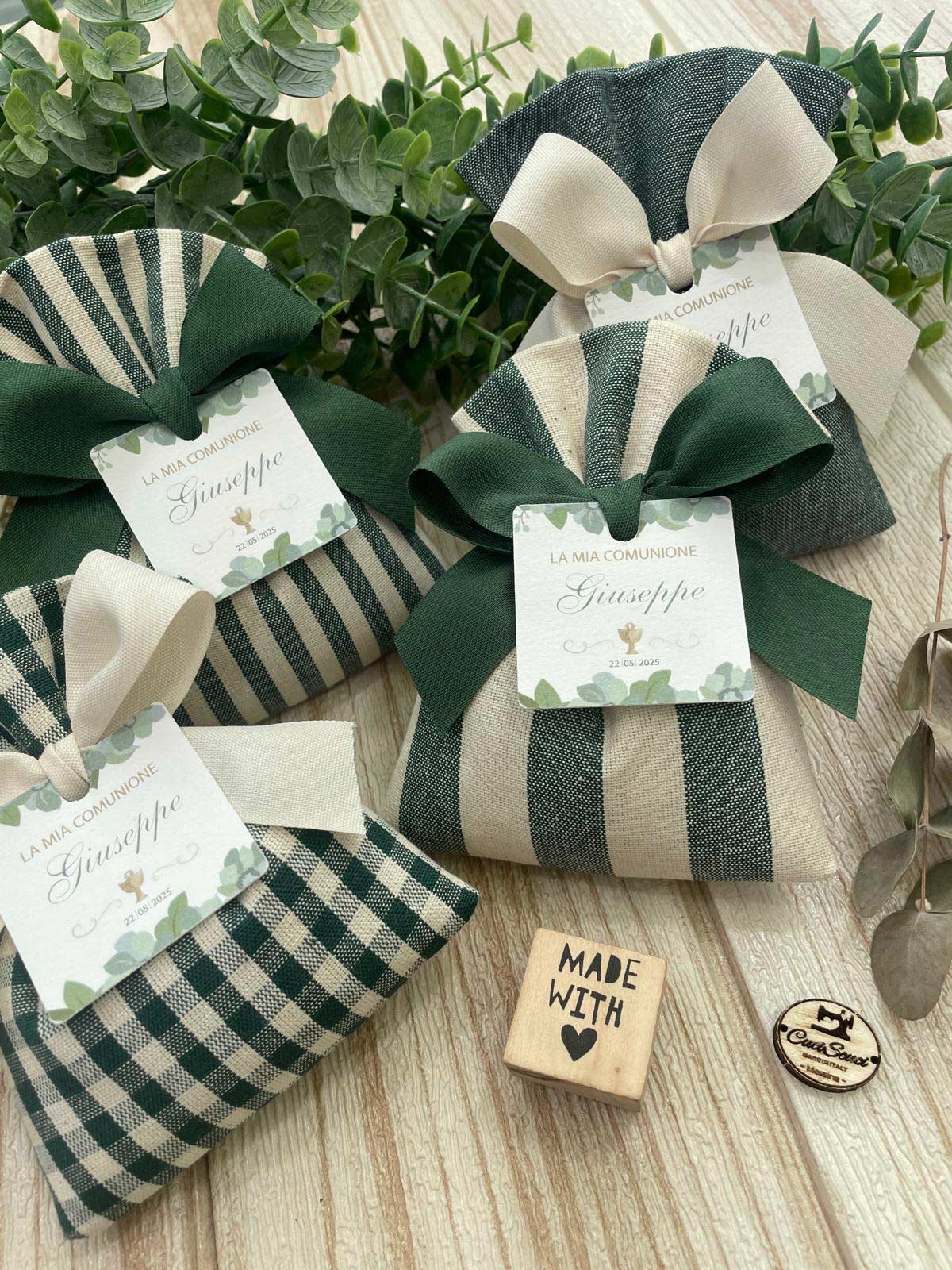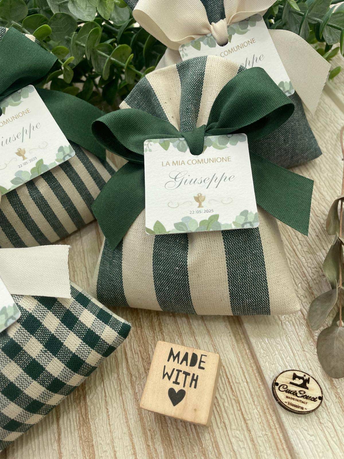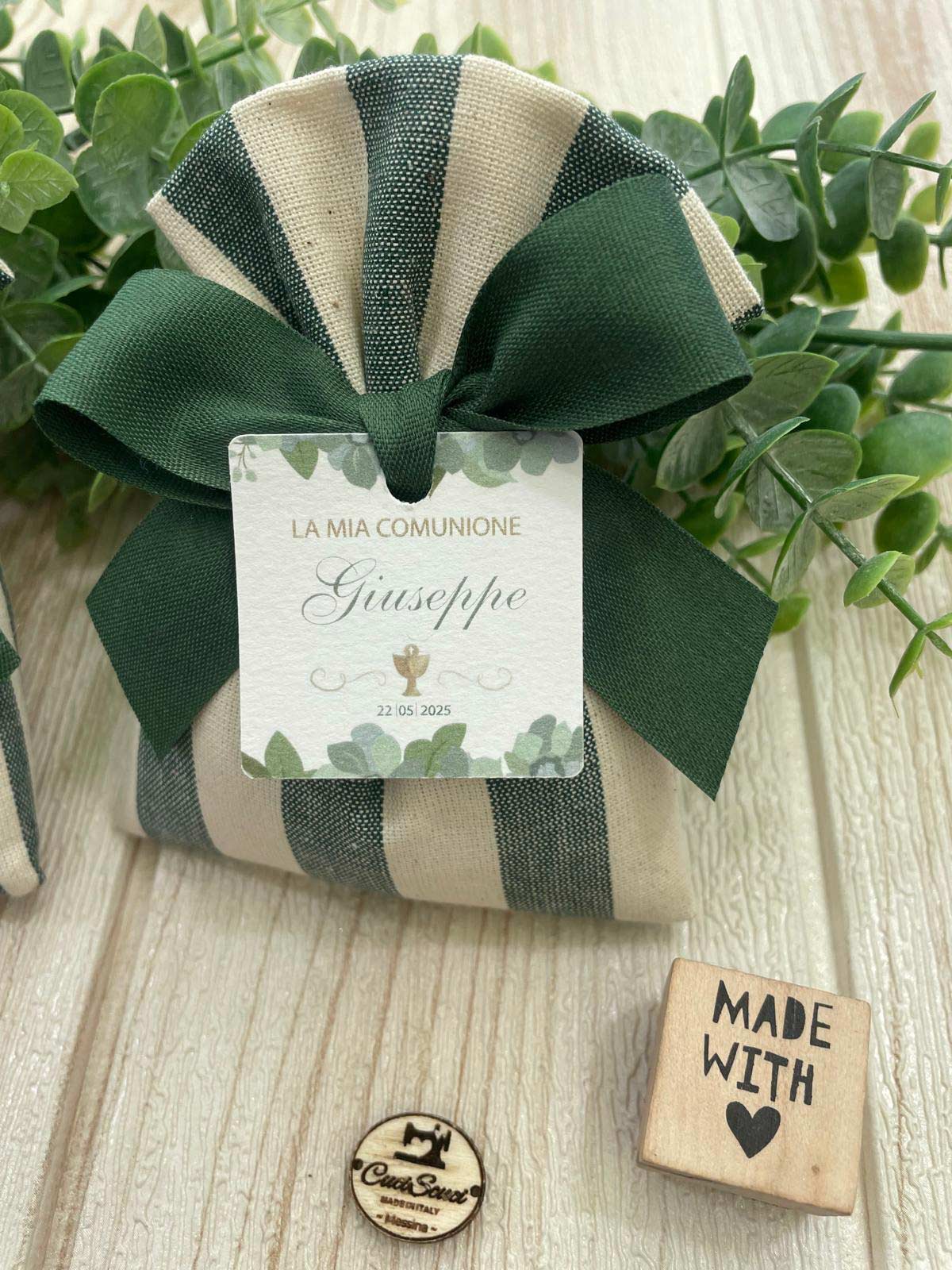 La bomboniera, pronta da donare ai tuoi ospiti, comprende il sacchetto, confezionato con imbottitura in ovatta, fiocco abbinato, 5 confetti in busta sigillata, con o senza tag.