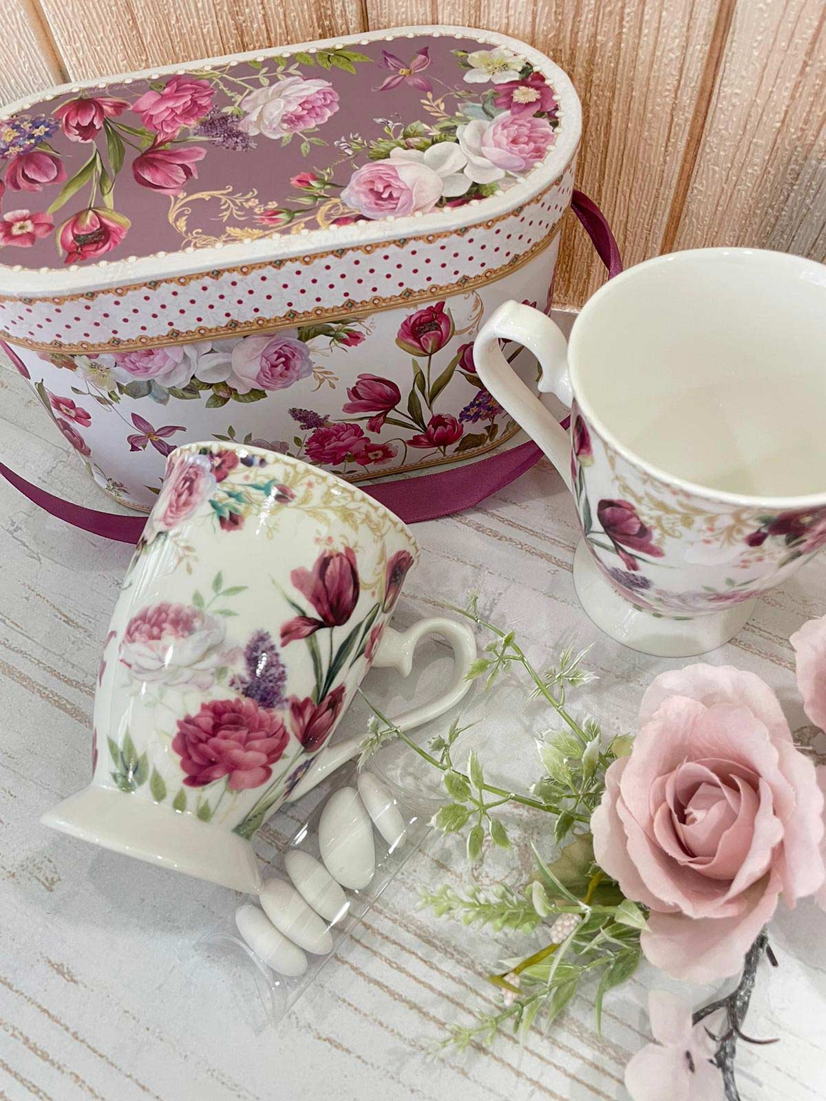 Raffinato set composto da due eleganti tazze in porcellana, custodite in una scatola coordinata con delicato decoro floreale, espressione della romantica linea Bouquet di Charme di Le Stelle. Un oggetto che unisce estetica e funzionalità, capace di trasformare un gesto quotidiano come il tè o il caffè in un momento di piacevole condivisione.
