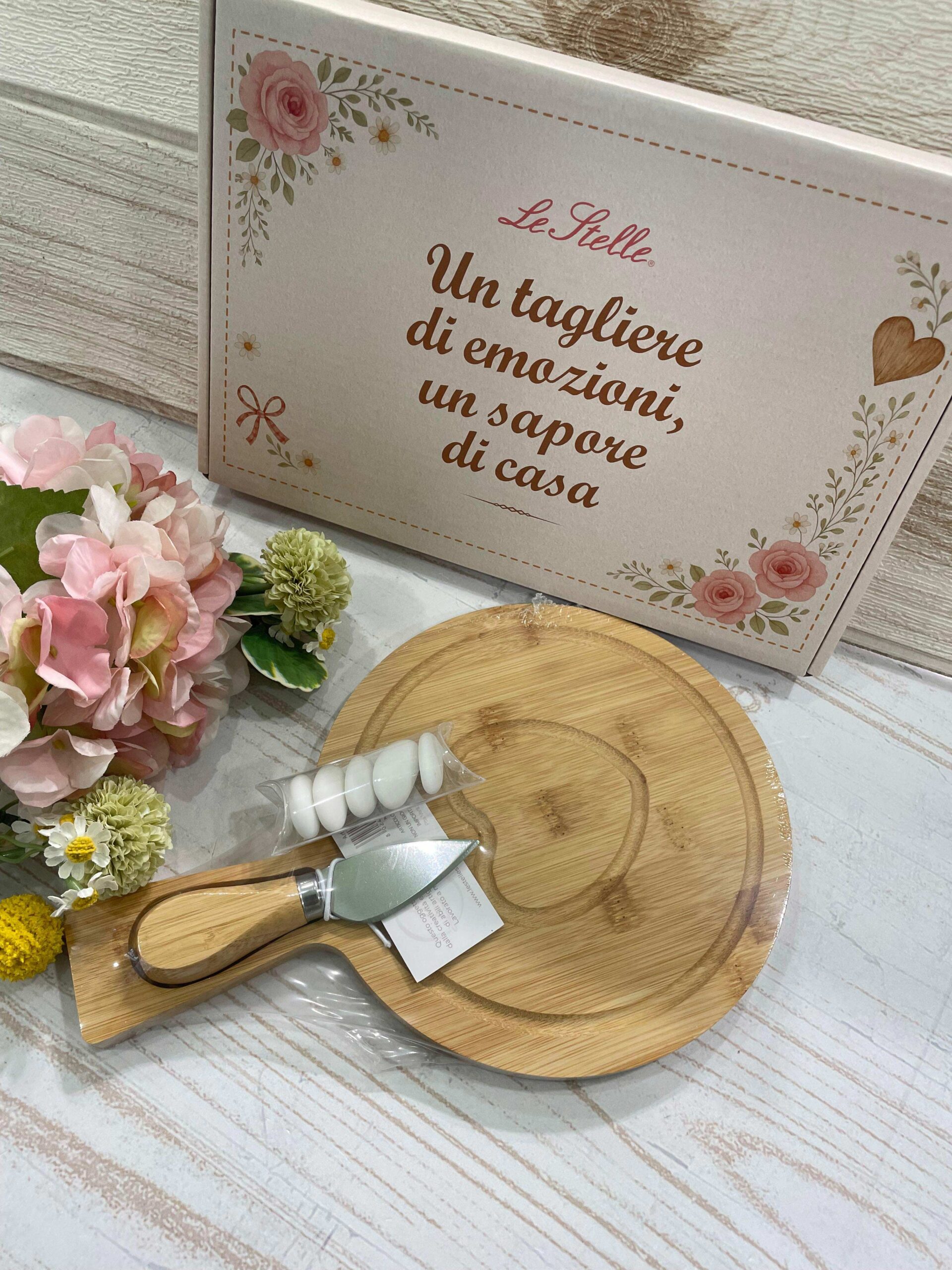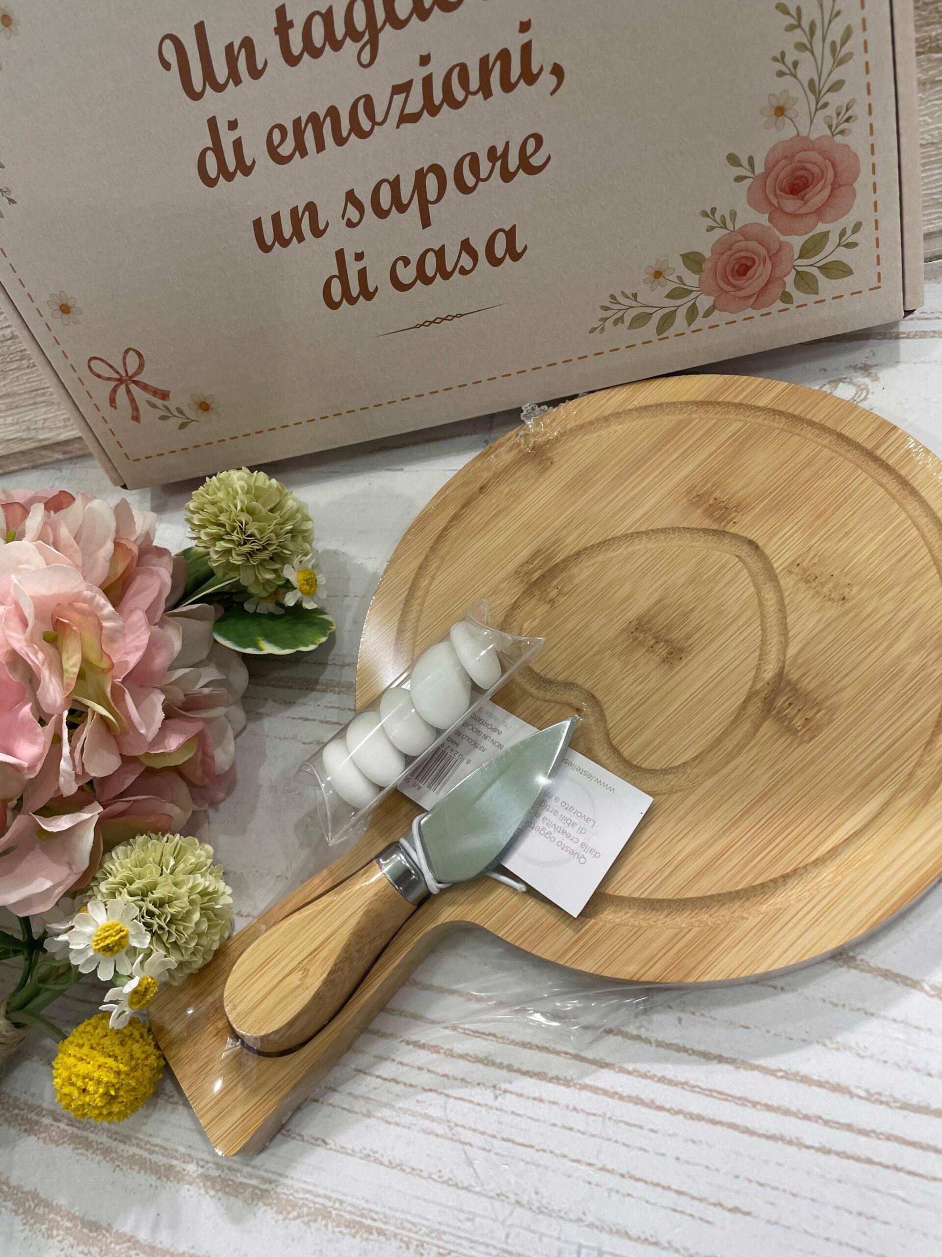Le dimensioni compatte lo rendono pratico e versatile, ideale per servire formaggi durante aperitivi, degustazioni o occasioni speciali, mentre la qualità del legno garantisce solidità e durata nel tempo. Il design essenziale, impreziosito dalla presentazione curata, trasforma questo set in una bomboniera significativa e distintiva, capace di unire utilità quotidiana e valore simbolico.
