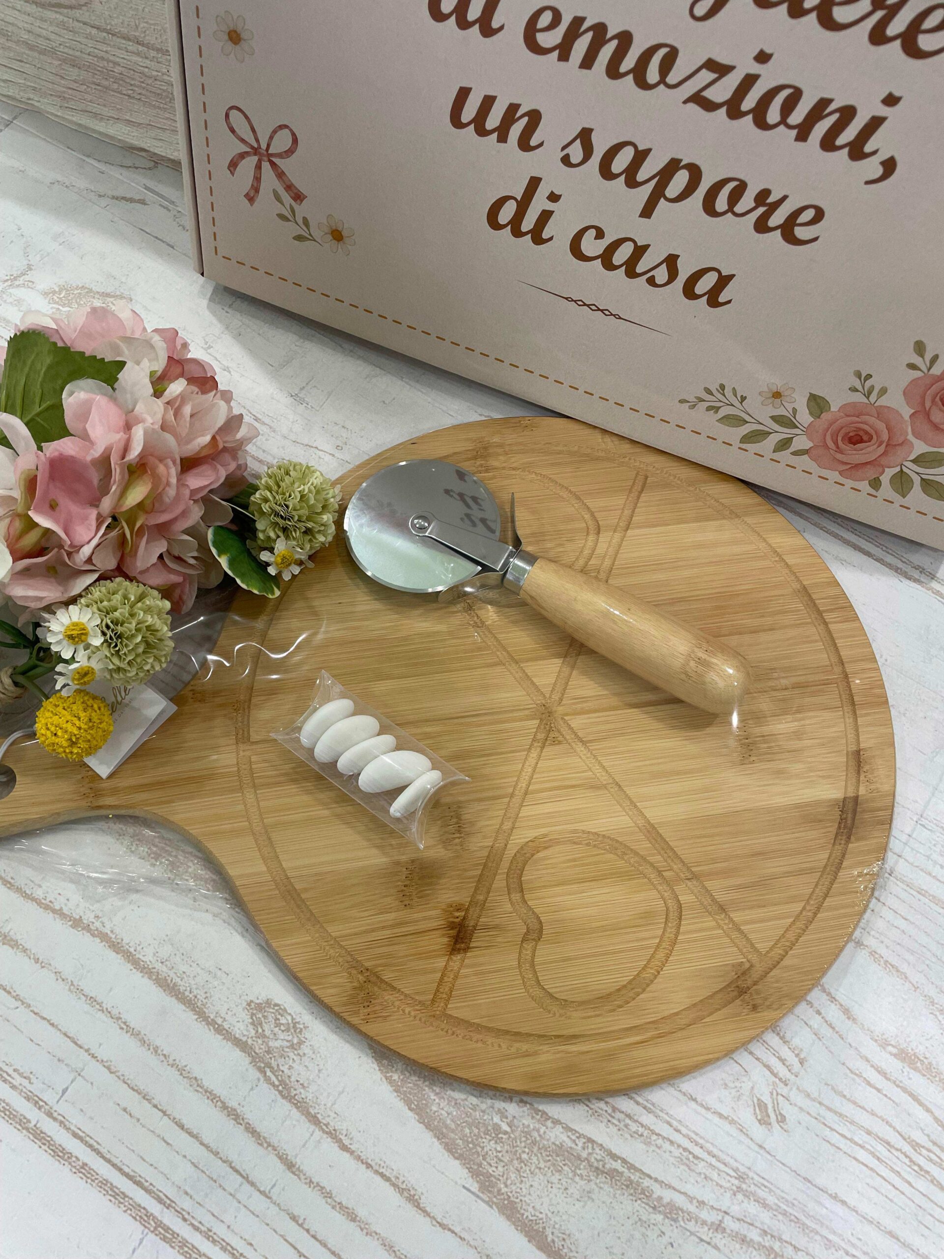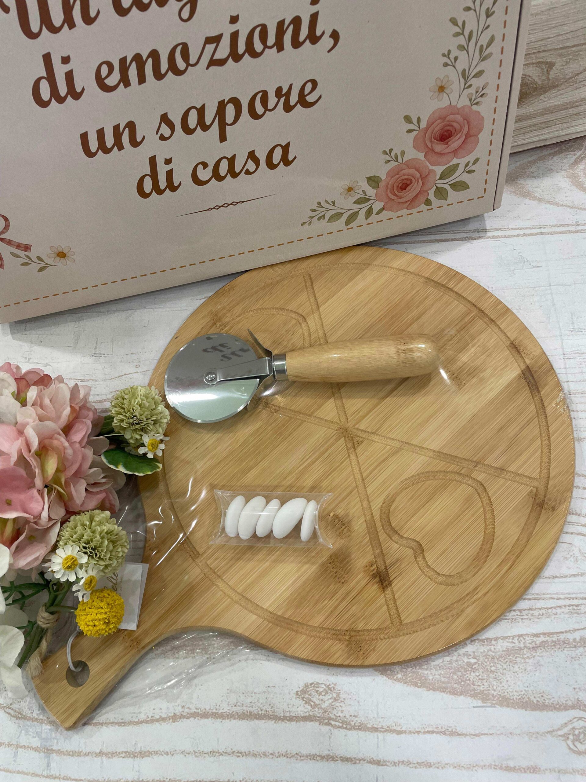 Il tagliere, solido e resistente, offre una base ideale per tagliare e servire la pizza durante occasioni speciali o nella quotidianità, mentre il tagliapizza garantisce un utilizzo pratico e scorrevole. Il design essenziale, arricchito dalla presentazione curata, rende questo set una bomboniera significativa e distintiva, capace di unire utilità e valore simbolico in un oggetto destinato a durare nel tempo.