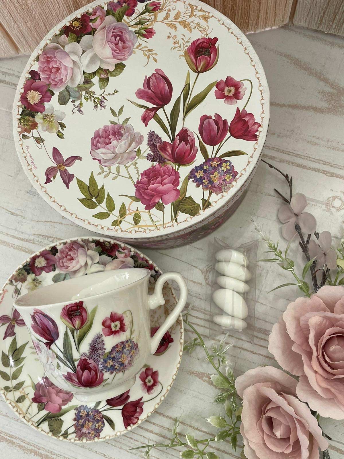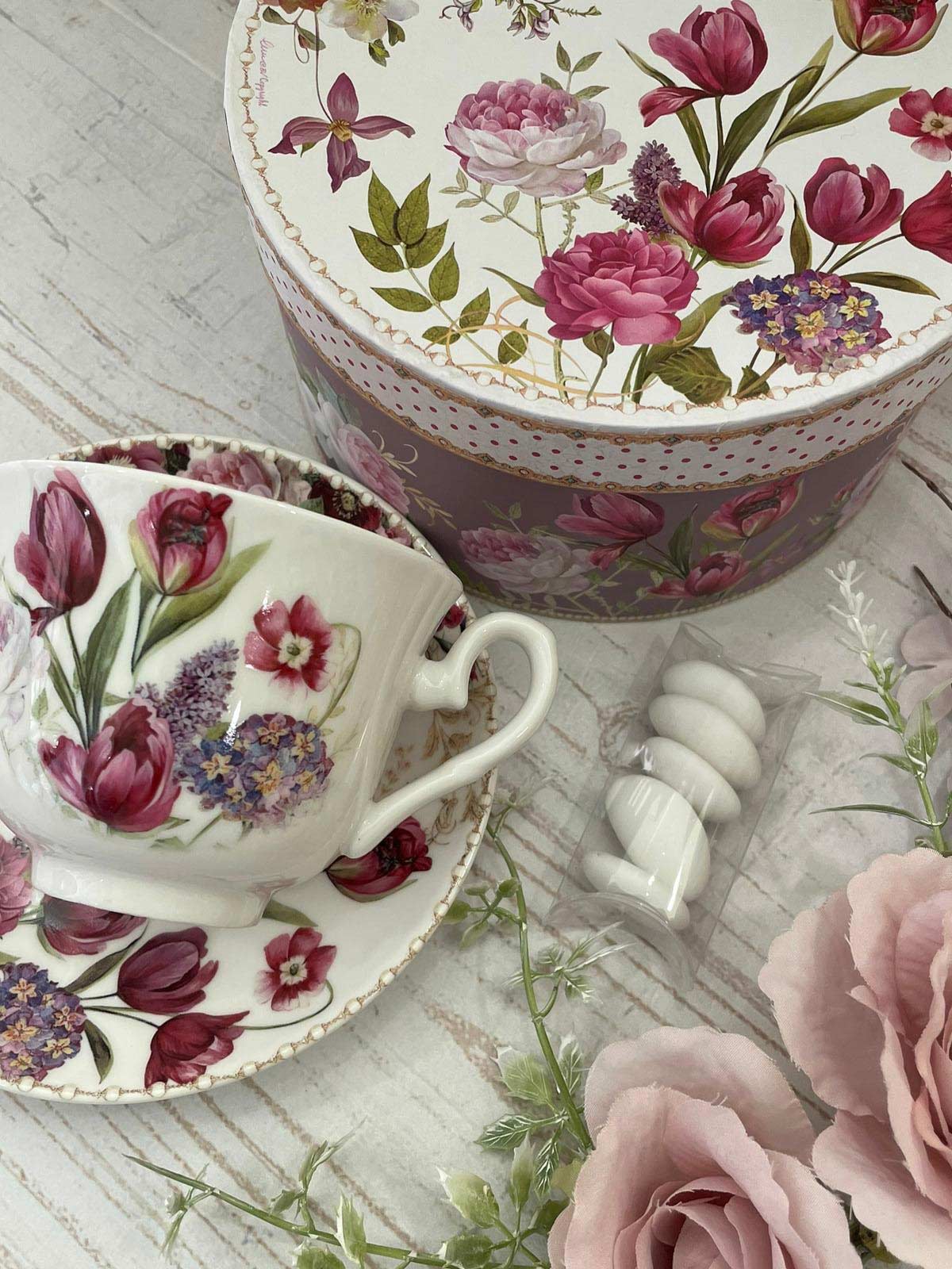 Elegante tazza da tè in porcellana completa di piattino, custodita in una raffinata confezione coordinata con delicato decoro floreale, espressione della romantica linea Bouquet di Charme di Le Stelle. Un oggetto che unisce armonia estetica e funzionalità, pensato per rendere ogni momento di pausa un gesto di stile e dolcezza.